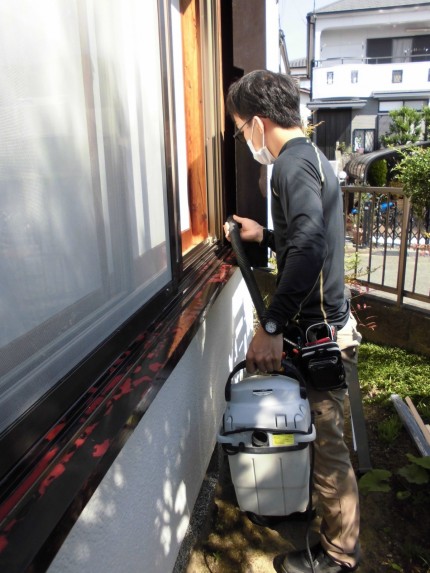 施工中④ 既存の雨戸レールの取り外しが完了しましたら、戸袋内とレール部のごみ、埃を掃除機を使用し取り除いていきます。