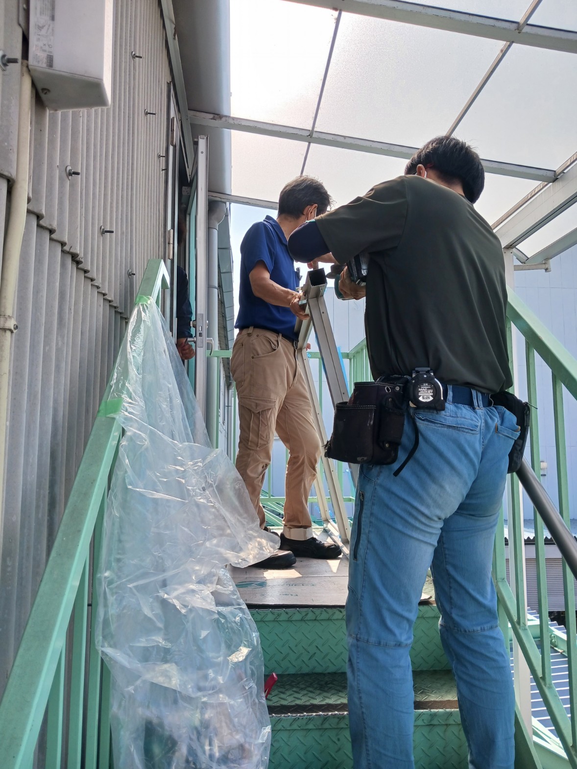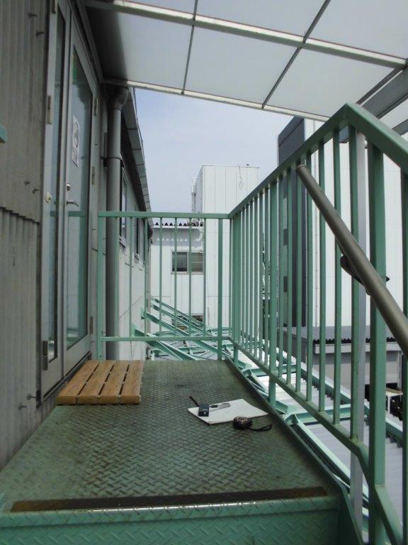 既存工場3F入り口の階段踊り場です。雨除けのテラス屋根はしているのですが、横殴りの雨の場合、踊り場まで雨が吹き込み靴が濡れてお困りでした。今回、階段踊り場廻りに雨除けの囲いをしてほしいとのご依頼でした。現場にて打合せの結果、テラス屋根と同じ色のアルミ材とポリカーボネートを使用し、高さ2M程の囲いをL字で取付する事となりました。