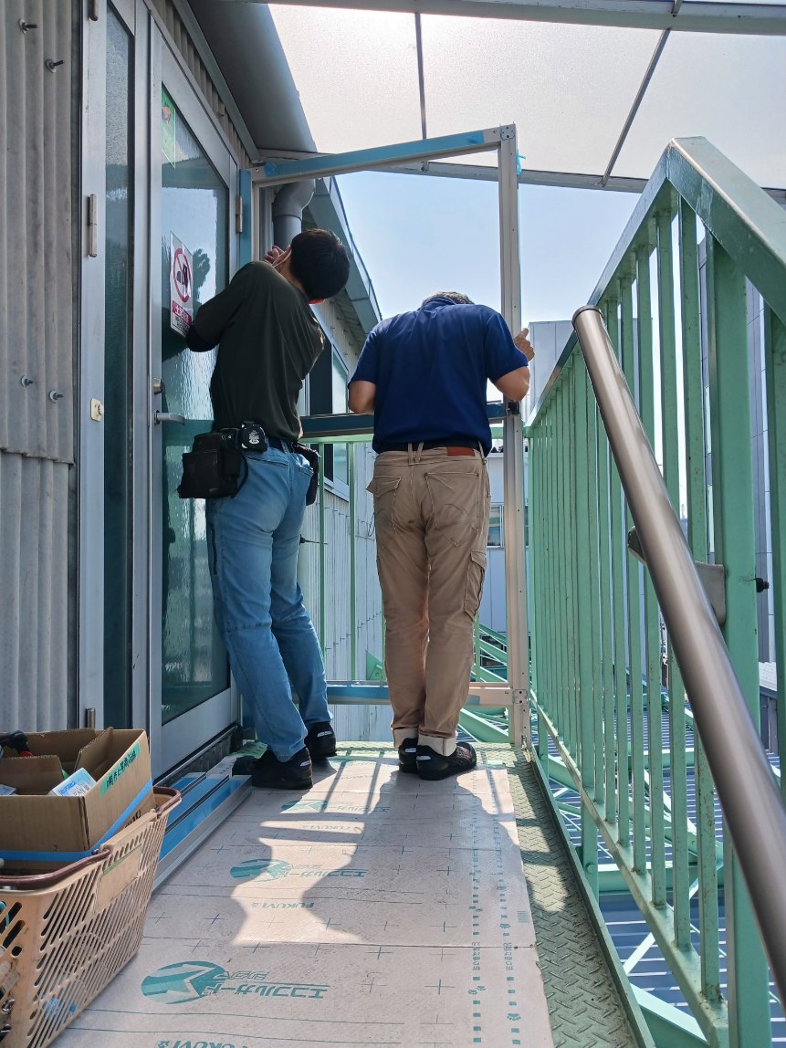 施工後 アルミ囲い骨部の取付が完成しましたら、ポリカーボネートを1枚ずつ設置しアルミアングル材で挟み込み、アルミアングルをしっかりと電動インパクトドライバーでビス止めしていきます。下部10センチ程にもポリカーボネートを設置しますので、合計9カ所同様に作業し完成となります。これで、横殴り雨でも踊り場に雨が入る事は無くなりました。