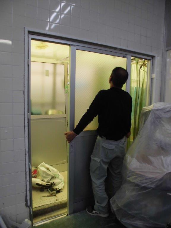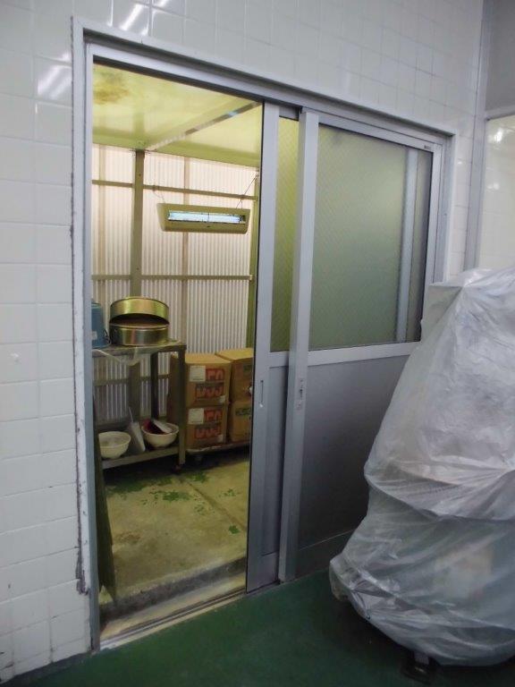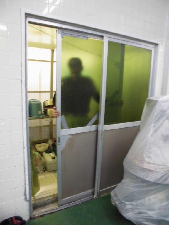 施工前 工場入り口店舗引戸レール部腐食破損、障子下部も腐食ひび割れが有り、ほぼ動かない状態でした。今回、既存を全て取り除き新しく店舗引戸を取付する事となりました。