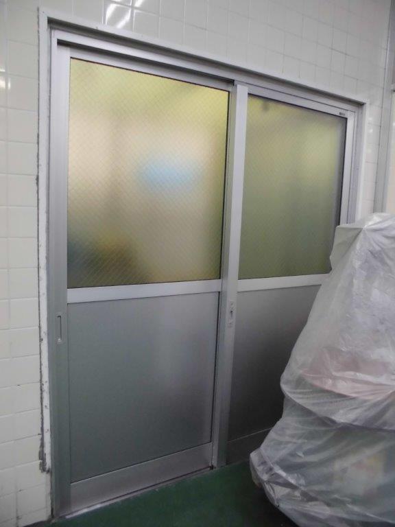 施工後 硝子障子の動作確認調整、鍵に施錠調整をして完成となります。今回の商品はYKKAP製店舗引戸9TU・ピュアシルバー色・上部硝子は型板4㎜・下部はアルミサンドパネル3㎜を使用しました。