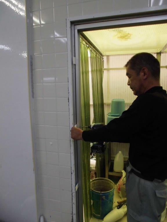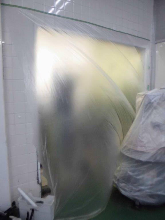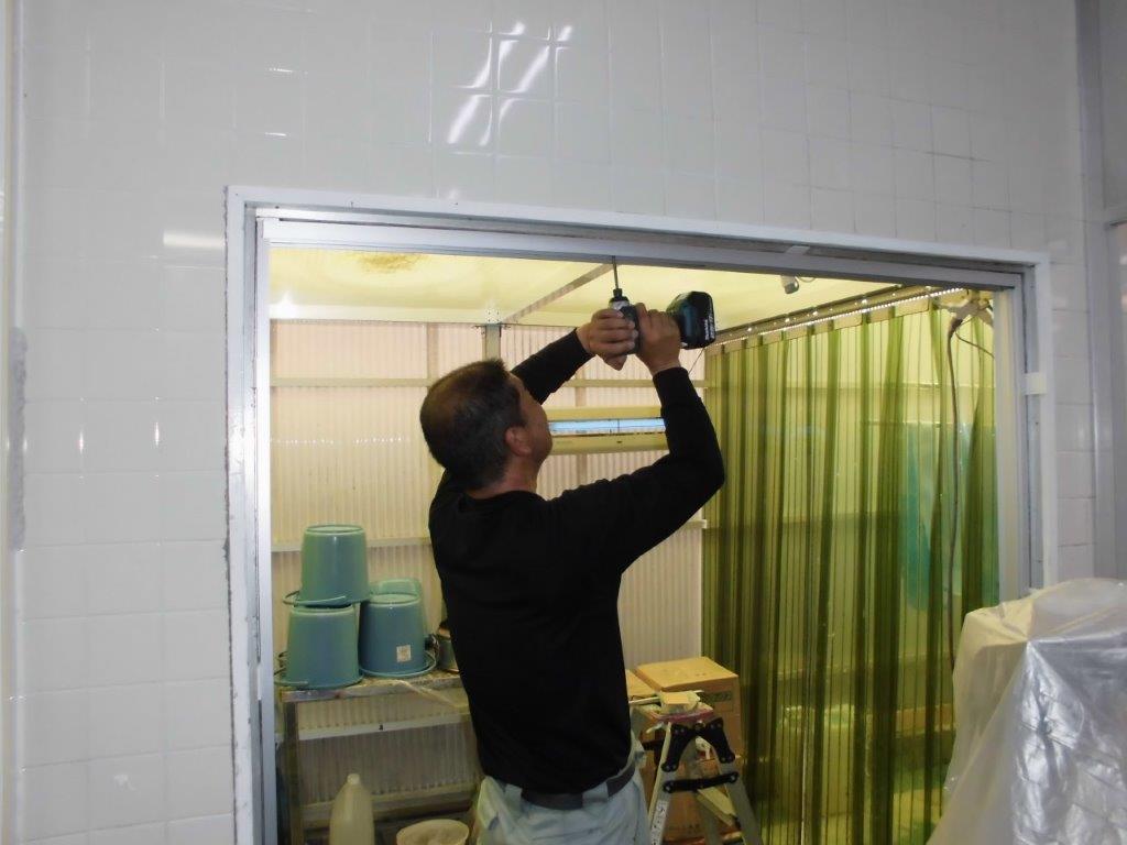 施工中② 下レール部を取り外すには、ハツリ機を使用します。ホコリ等が出ますので、作業前、工場内へホコリ等が侵入しないようにのビニールで養生してから行います。