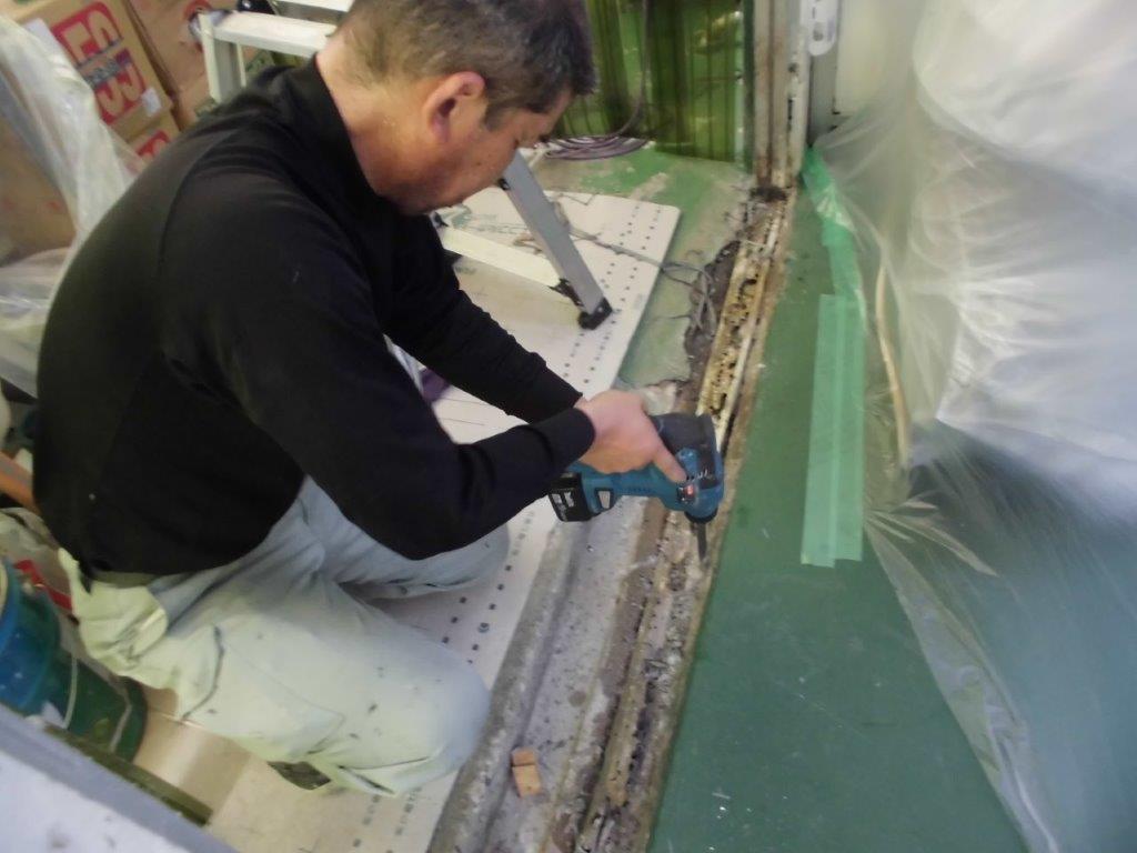 施工中③ ハツリ機等を使用し、腐食している下部レールを撤去していきます。