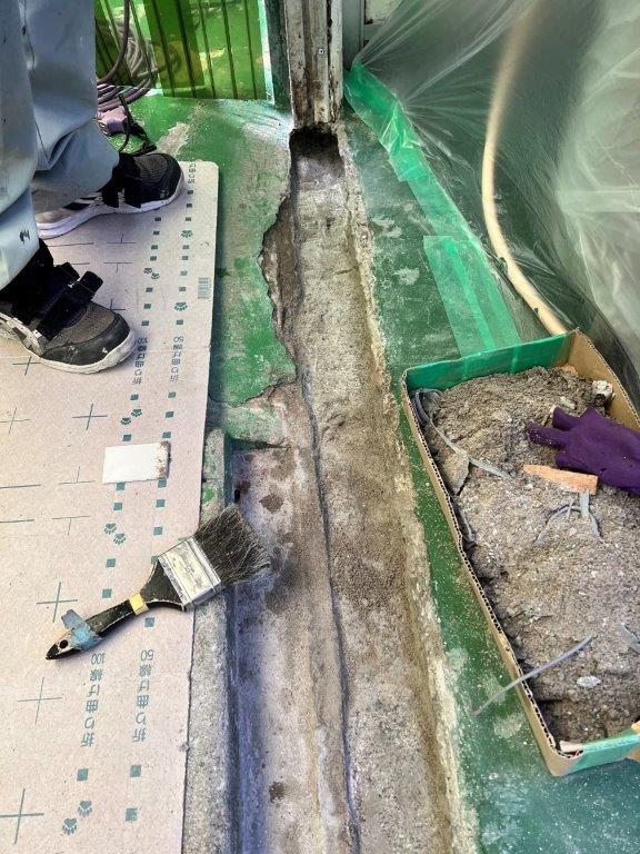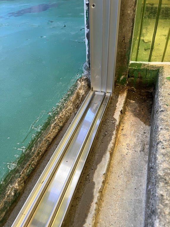 施工中⑦ 新設枠下レール部です。モルタル(セメントと砂を水で混ぜ合わせたもの)詰めし固定します。その後、新設枠廻りを外部からの雨水風の進入を防ぐ為コーコング処理を行います。