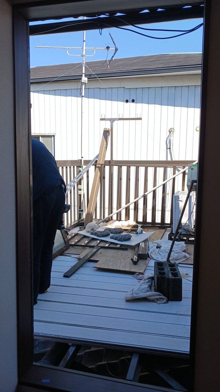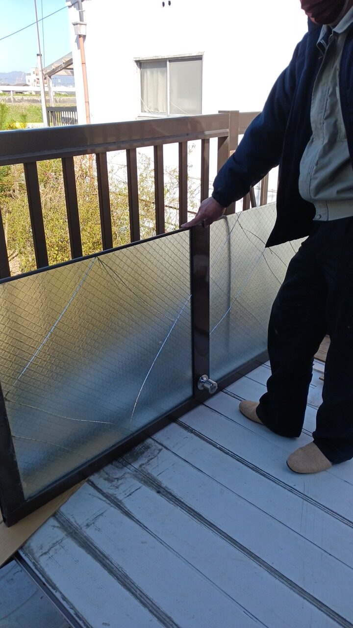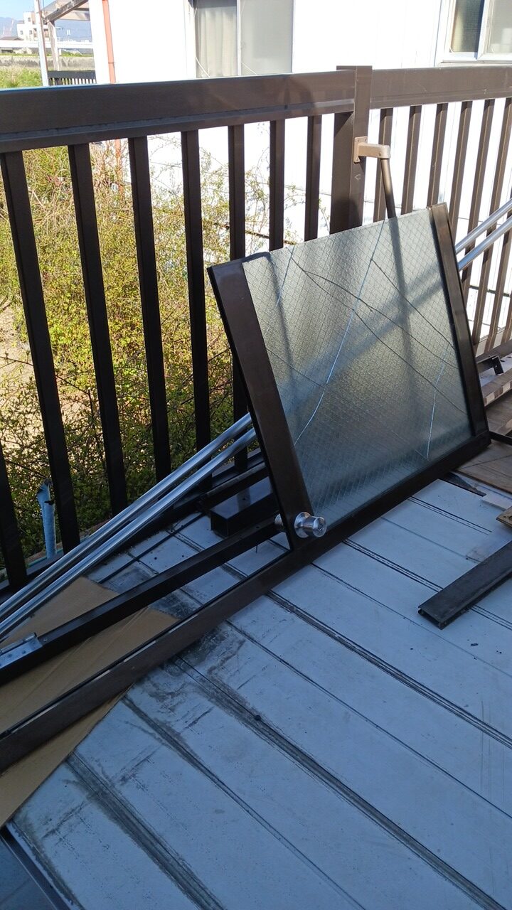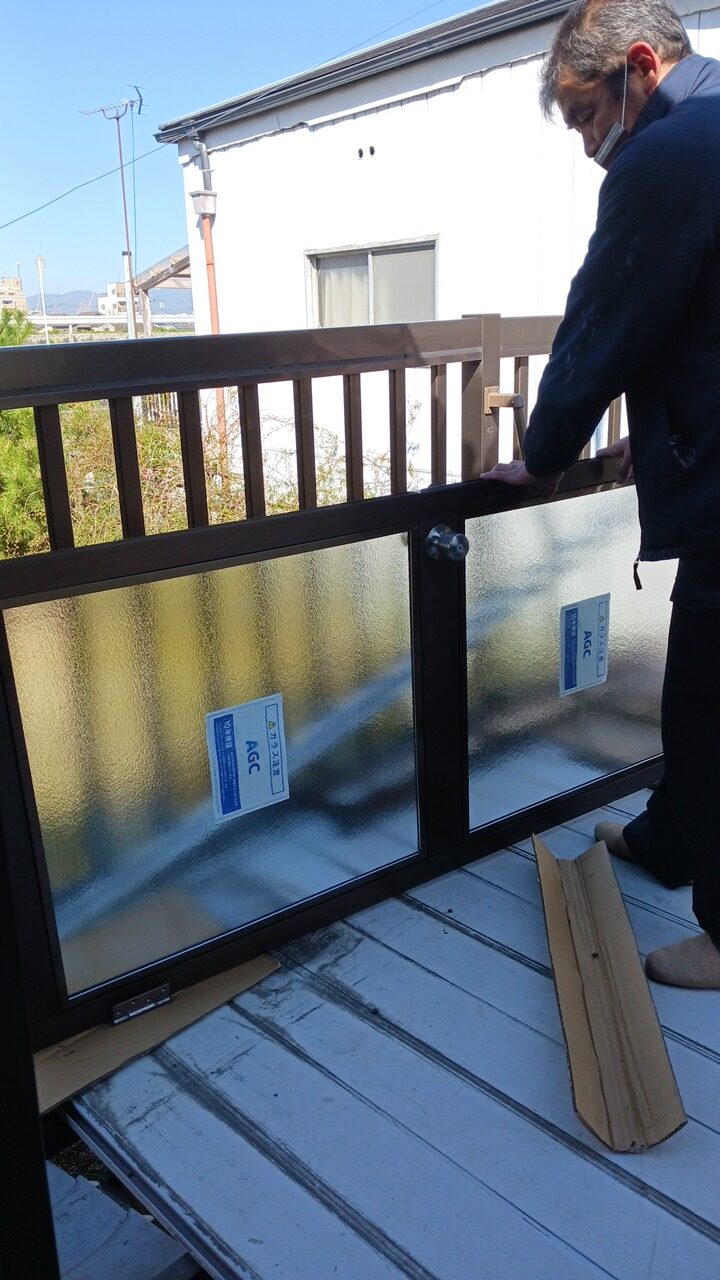 施行中③ 写真は下部硝子1枚を取り外した状態です。この後上部の硝子も取り外します。