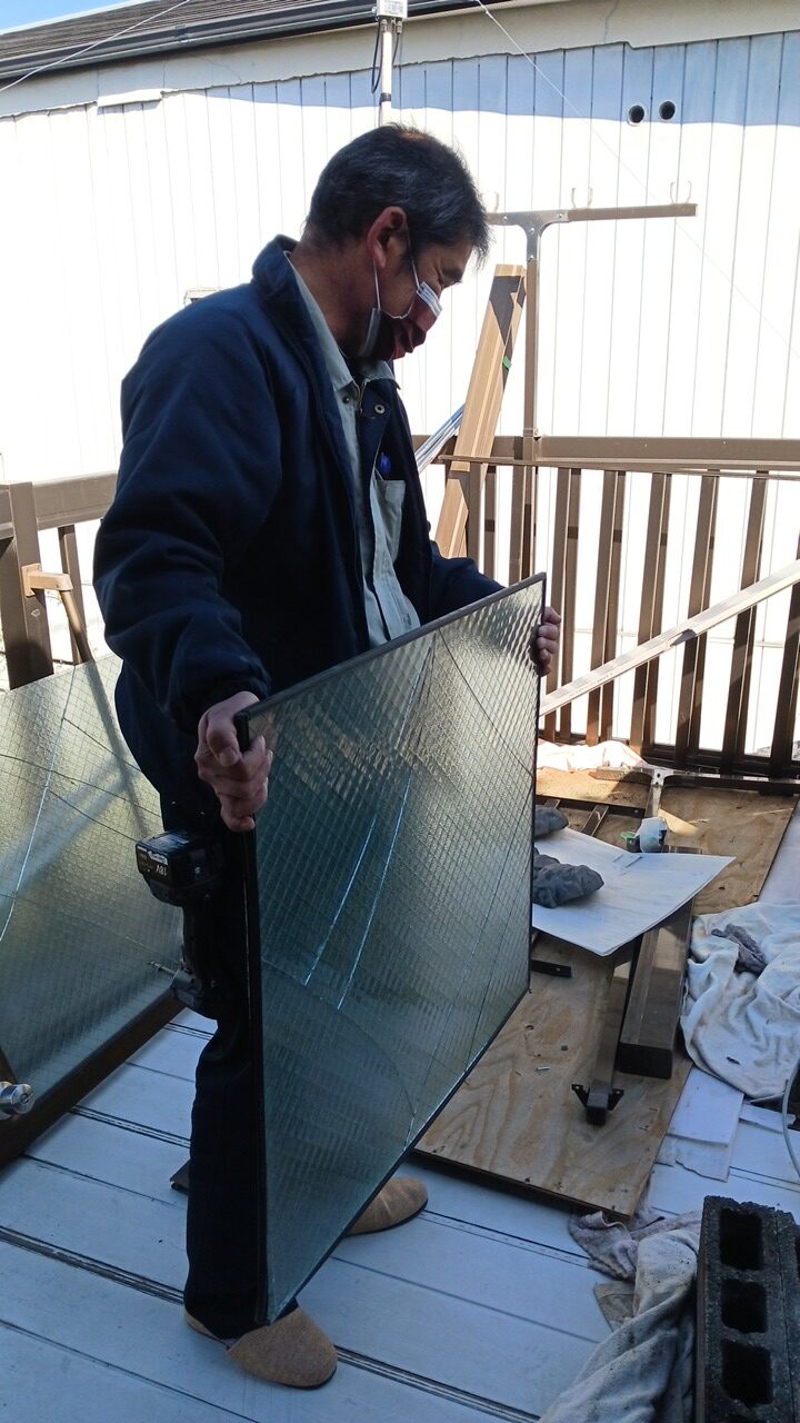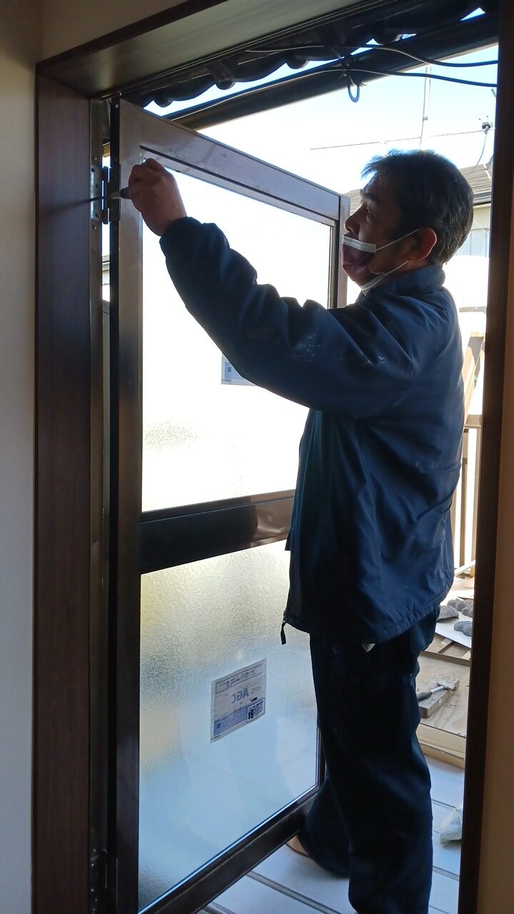 施行中⑤ 事前に最新オーダー製作したアタッチメント付LOW-E硝子をアルミ框ドアにはめ込みました。