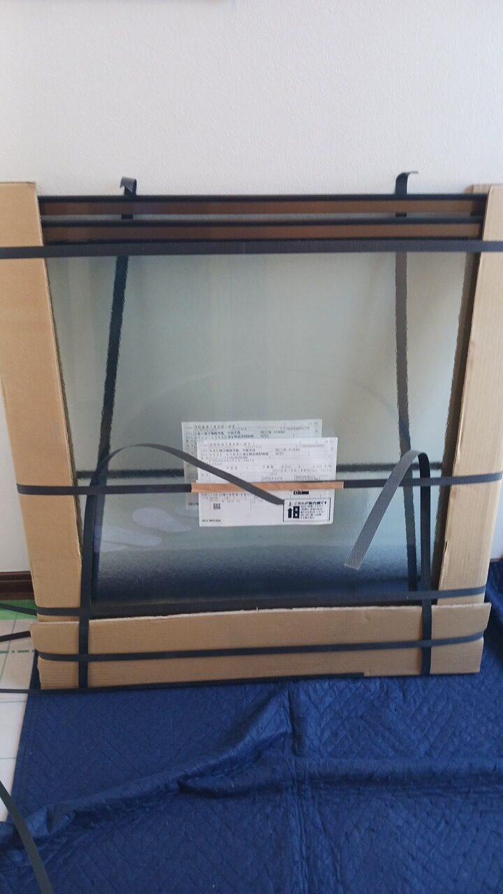 施行中④ 新しく設置するアタッチメント付LOW-E複層硝子です。この様に破損、傷のつかないように梱包されて搬入されます。