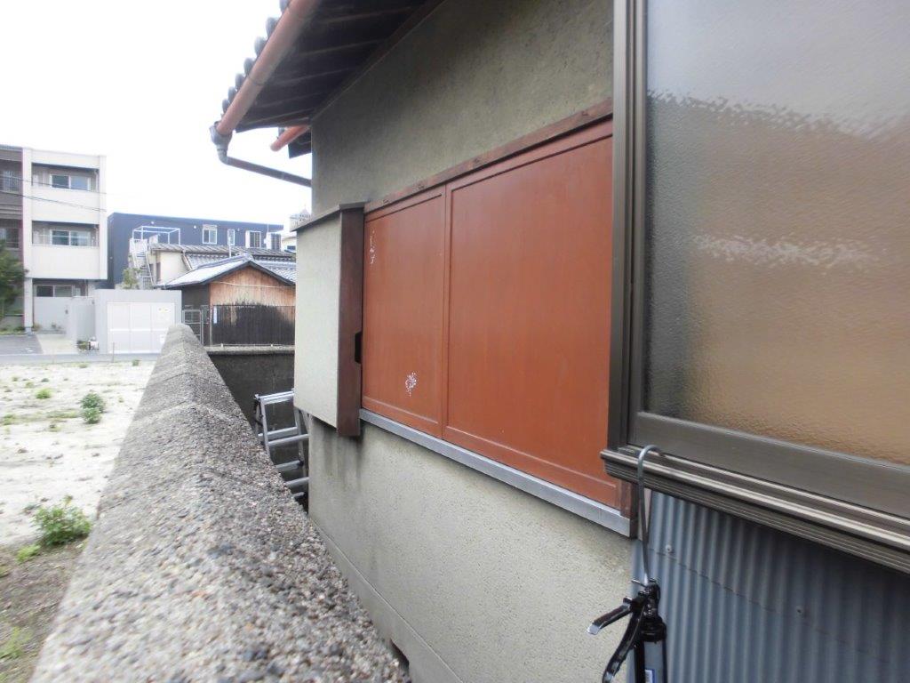 施工前 ご自宅1F雨戸付引き違い窓です。アルミ引き違いサッシに木製の雨戸が付いています。