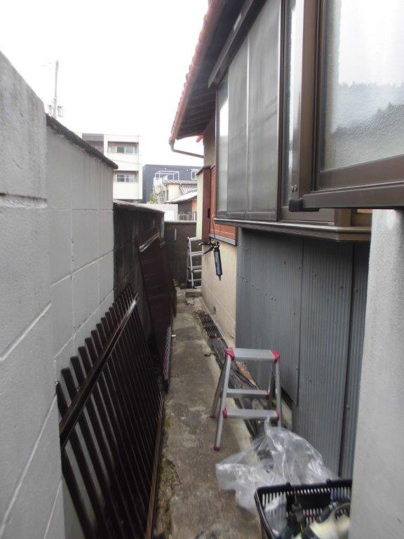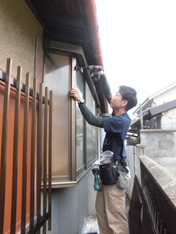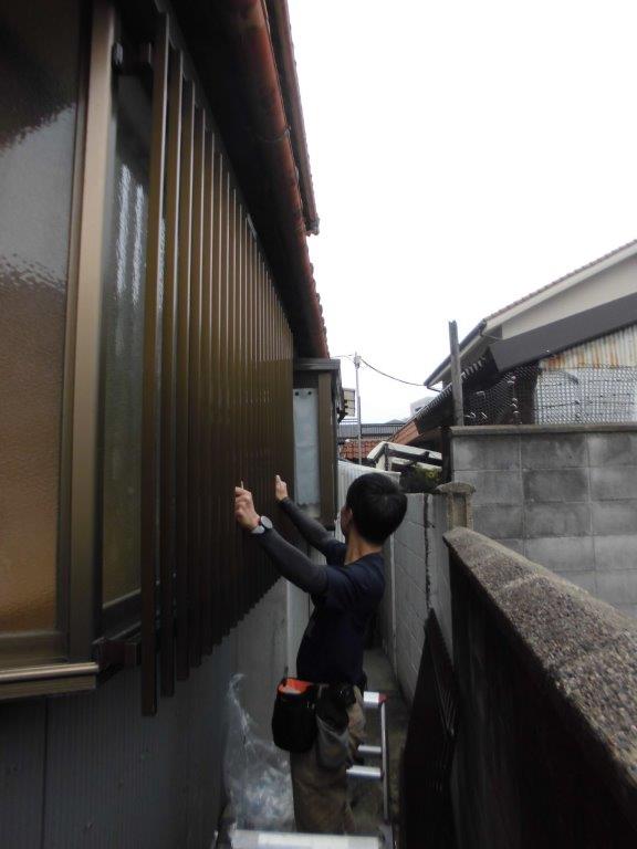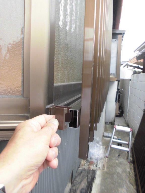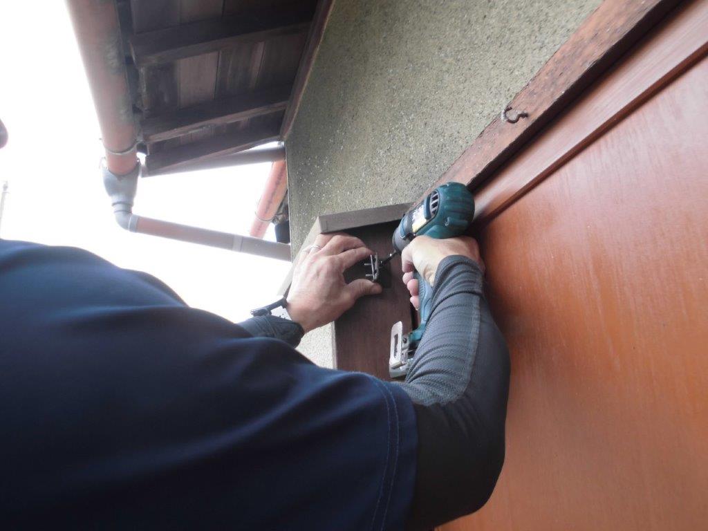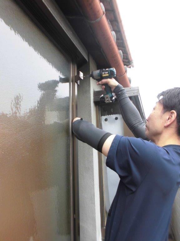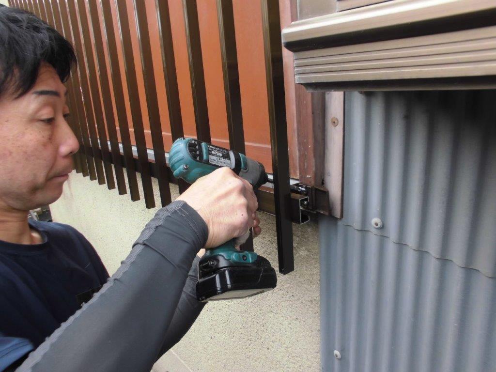 施工中②最初に雨戸付窓に縦面格子を取り付けていきます。まず、縦面格子の取付位置決めをし、戸袋側面に縦面格子用入隅用ブラケットを電動インパクトドライバーでビス止めしていきます。