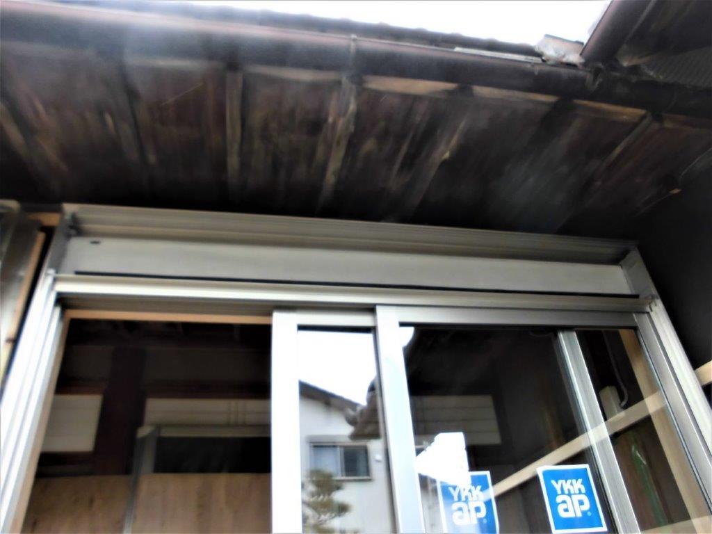 新設シャッター付サッシに電動シャッター設置調整の取付手順のご紹介致します。このサッシはシャッター一体枠といい引き違いサッシにシャッター枠がくっ付いているタイプの商品です。写真はサッシ枠はすでに歪み無く取付済みです。上部のボックスに電動シャッター本体が入ります。
