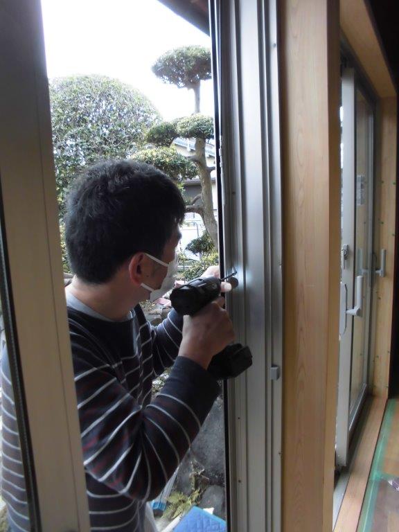施工中③シャッター本体が下に下がる為のガイドレールを設置し、電動インパクトドライバーでビス止めしています。この作業を左右2カ所します。