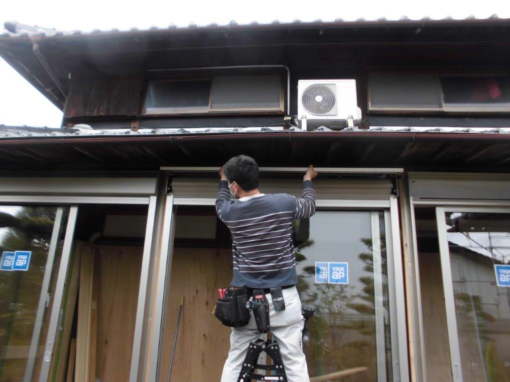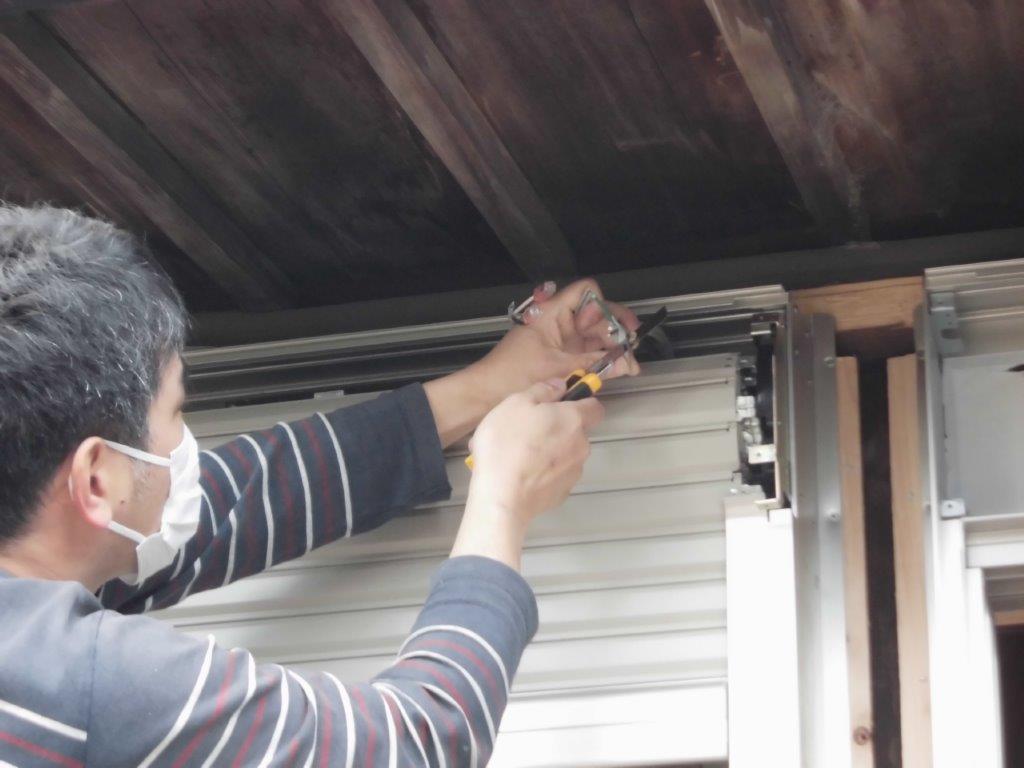 施工中①電動シャッター本体を上部ボックス内にはめ込み、左右ビス止めして固定します。