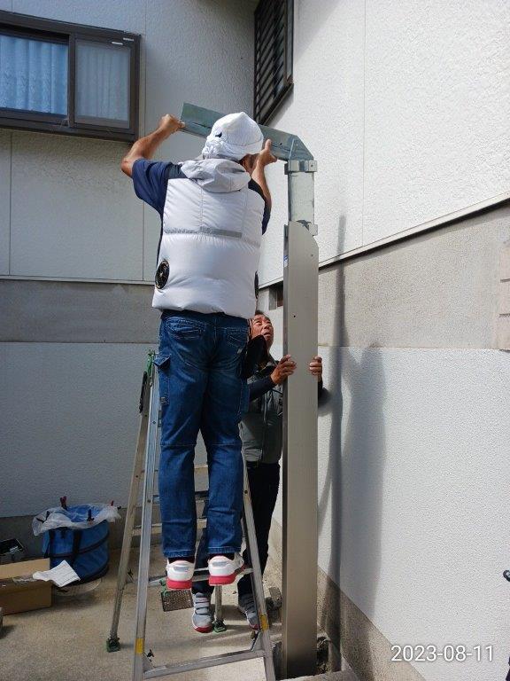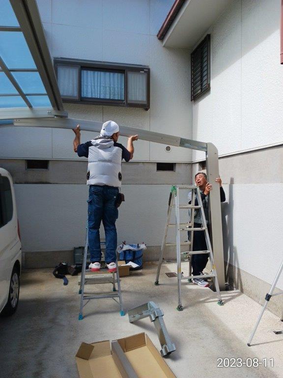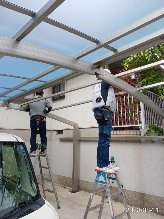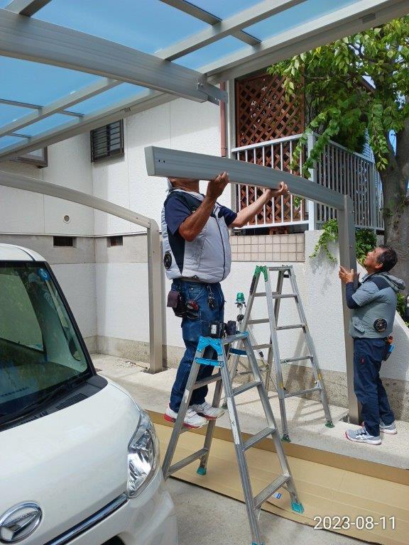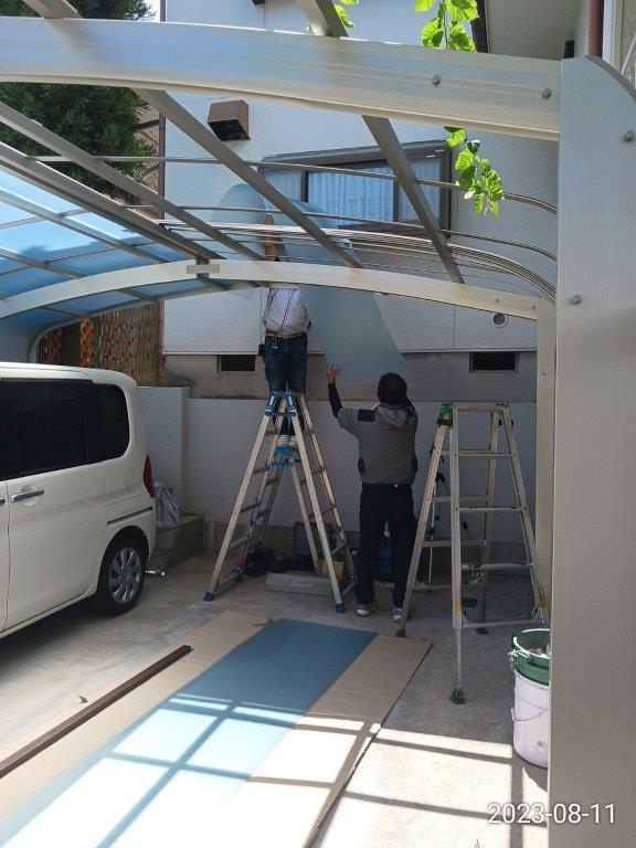 施工中⑪ カットしました屋根材をカーポート後ろ部から取付て行きます。屋根材の取付完了しましたら、左右前方柱に沿わせて雨樋を取り付けます。