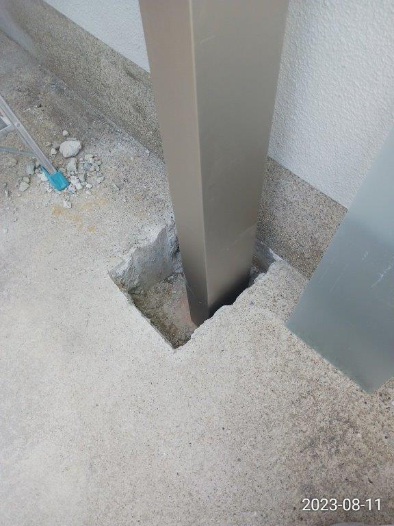 施工中① 今回はお車2台用カーポートの取付施工例を掲載させて頂きます。最初に柱取付位置を決め、土間コンクリートをグラインダー(コンクリート用刃)で四角く切断、その後ハツリ機を使用し深さ60センチ程掘ります。この作業を左右2カ所計4カ所行います。