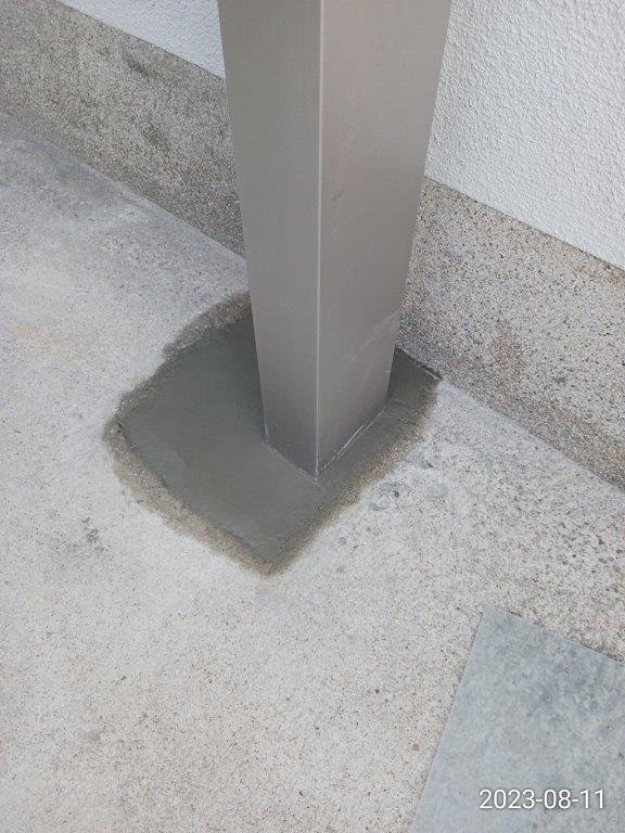 施工中⑧ レーザー墨出し器、水平器を使用し、平行垂直を測定し歪みの無い様に柱を固定し、モルタルを投入していきます。