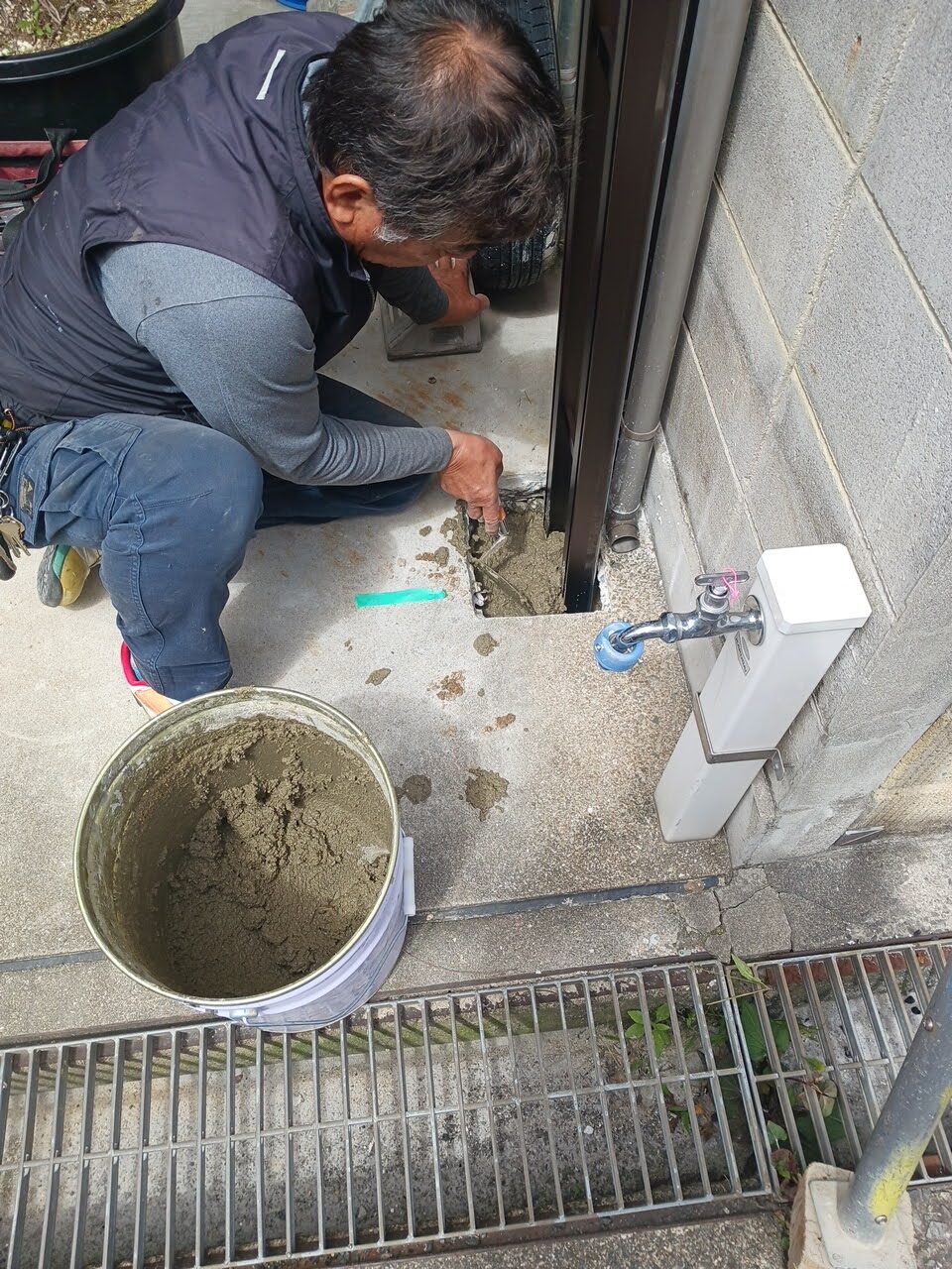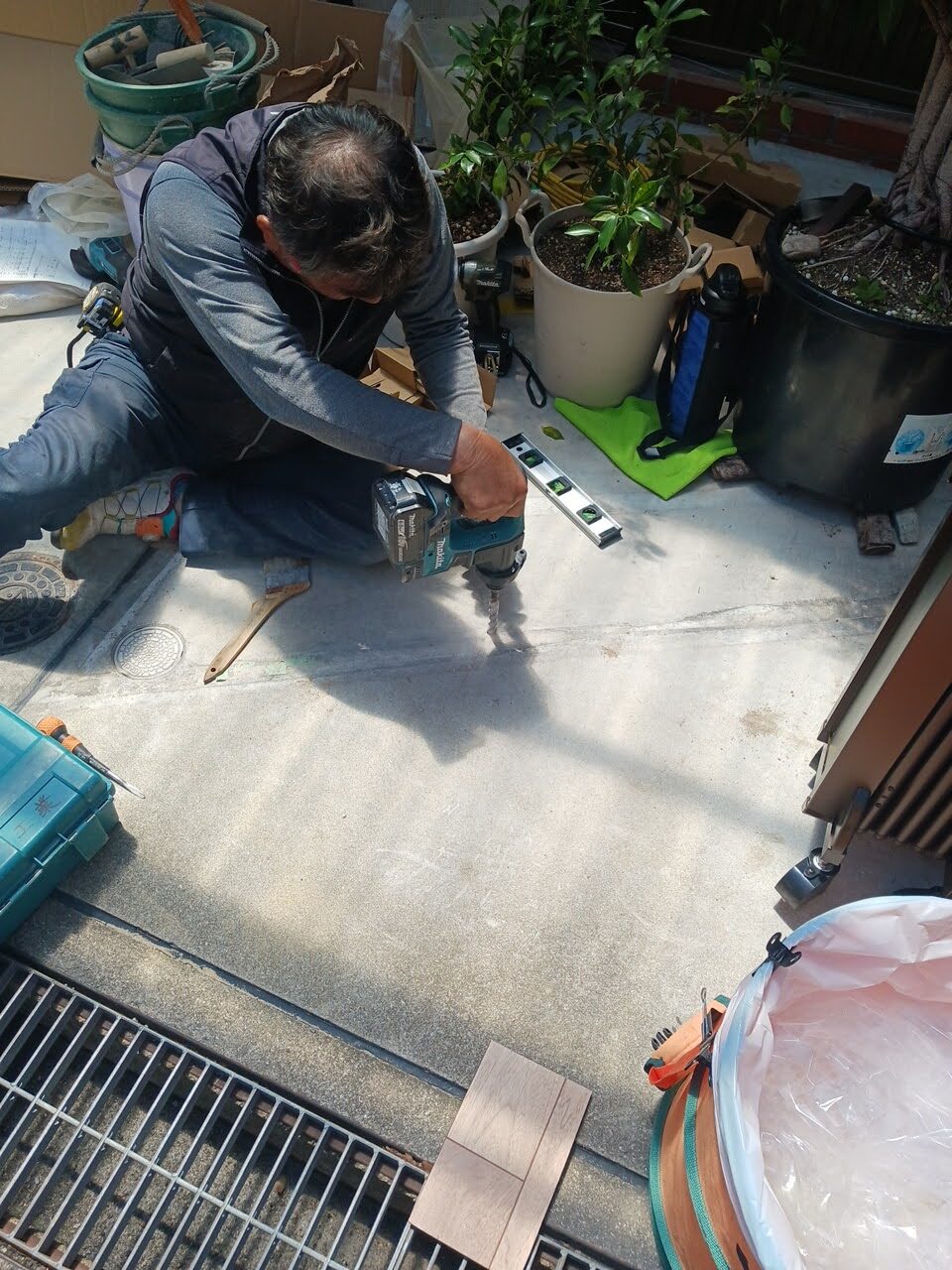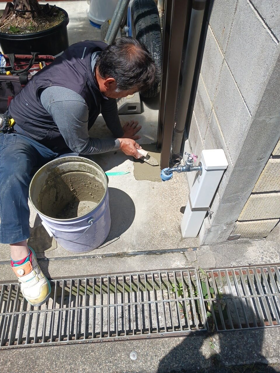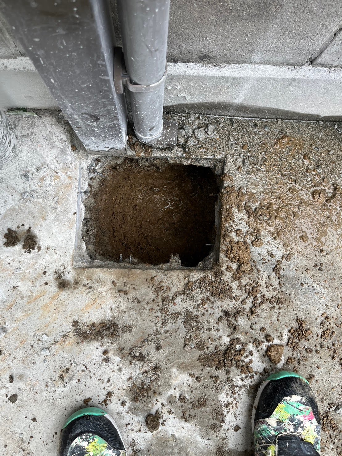 こちらは、施工中の写真になります。今回は、柱を建てる位置に水道管が走っている恐れがあったので、事前にハツリ工事を行いました。