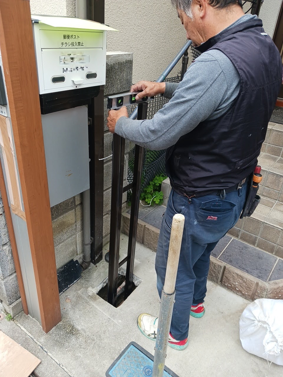 最後に、落とし棒の受けを地面に穴を開けて、埋め込んでいきます。最終の開閉確認をして問題なければ完成です。エクステリアのお悩みはぜひ、弊社にご相談下さい!お見積もり、現場調査は無料です!!
