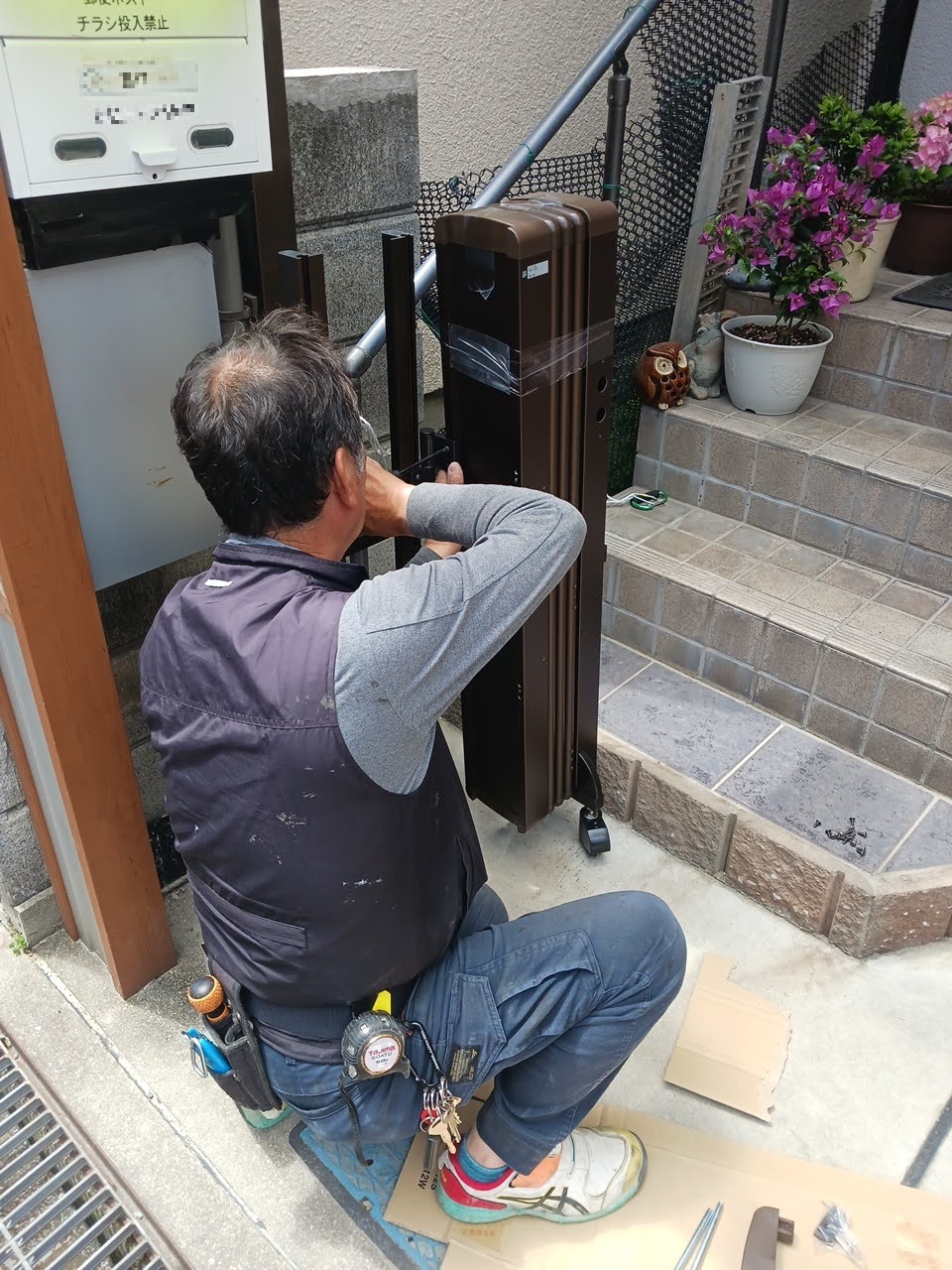 モルタルが固まったら、本体を吊り込んでいきます。本体を柱に固定出来たら、ハンドル、鍵受けなど取り付けていきます。