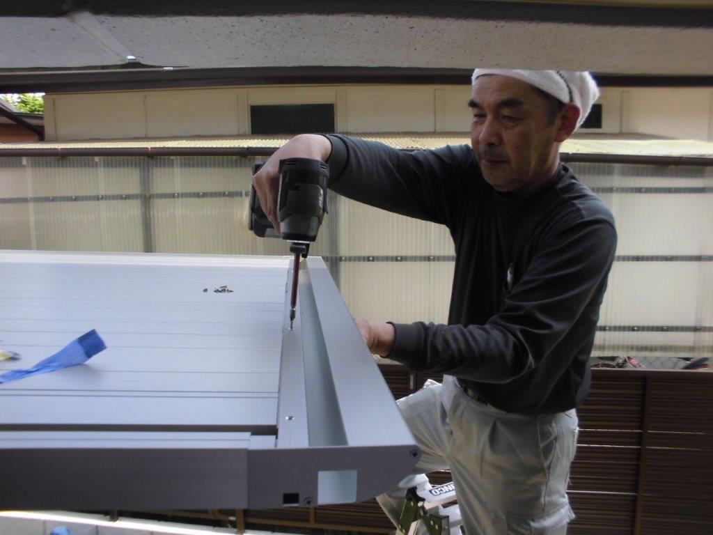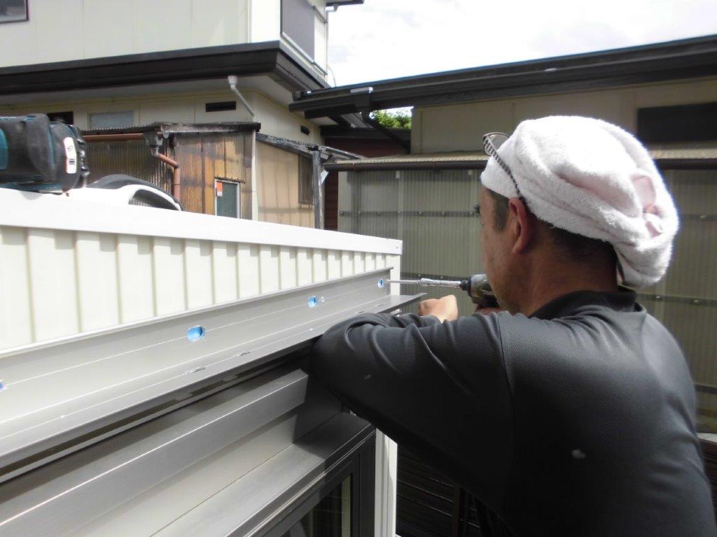 施工中⑥次に前枠(雨樋部)を庇本体と接合電動インパクトドライバーでビス止めしていきます。
