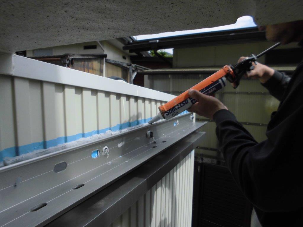 施工中⑦雨樋部小口等庇本体部からの雨漏りがしないようにコーキング処理をしていきます。