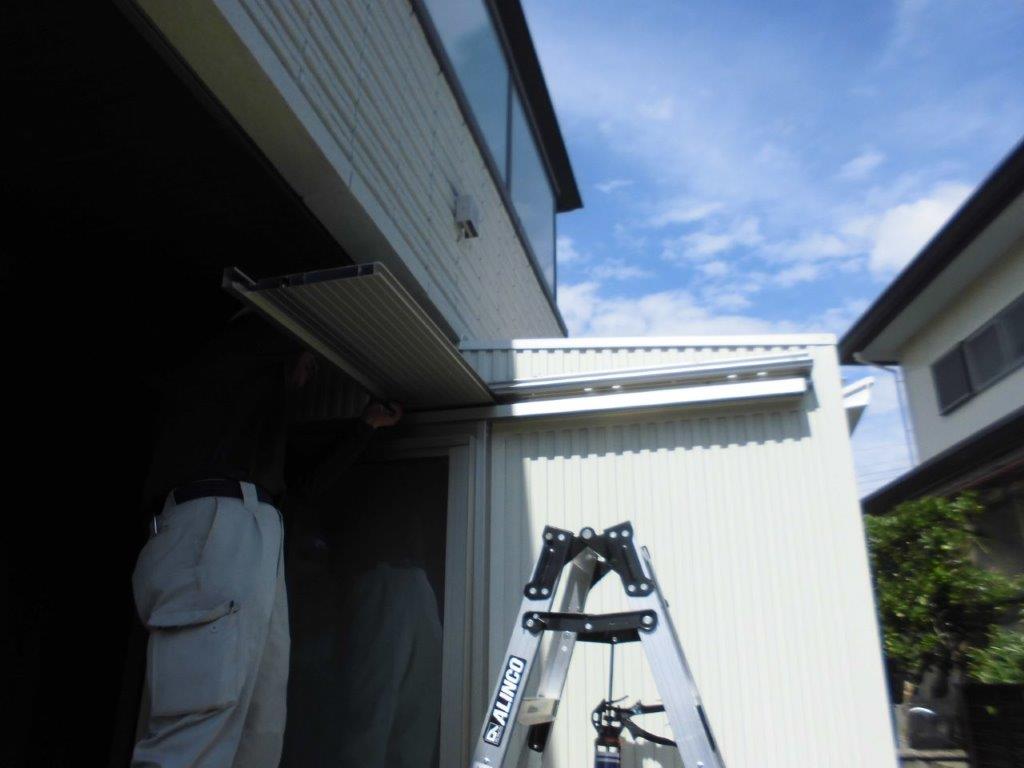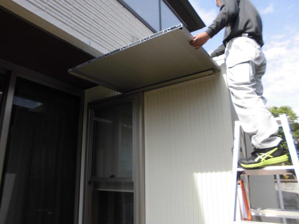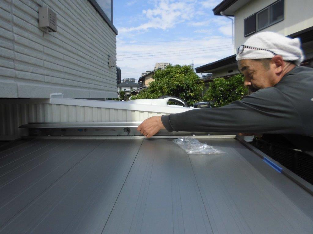 施工中③庇本体を端から順番にベースプレートに差し込みボルト締めしていきます。写真は左端1枚目を取付した所です。