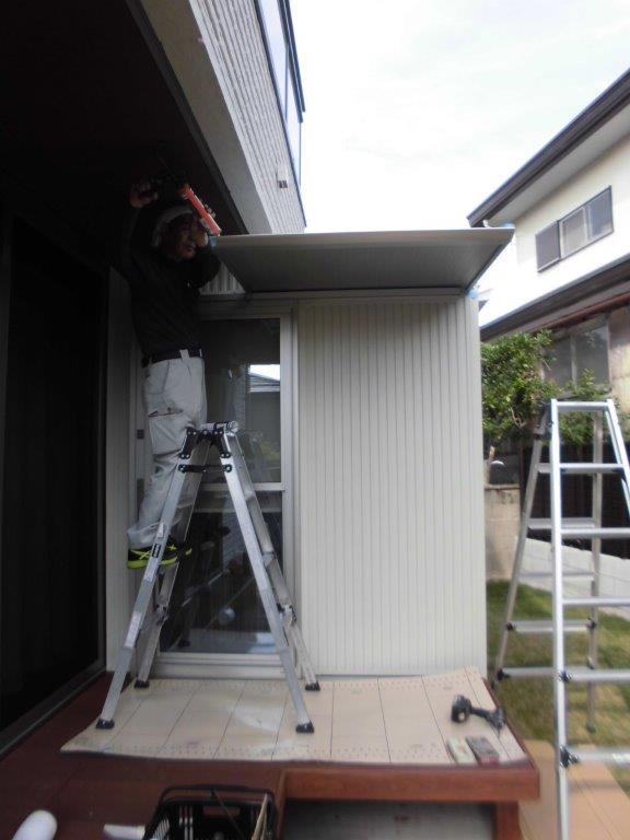 施工中④庇本体の取付を繰り返し合計5枚、ベースプレートと接合します。