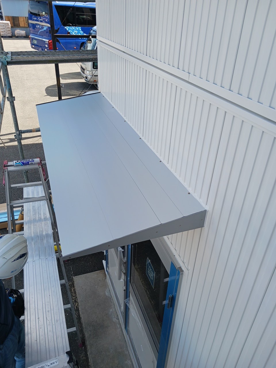 こちらは、上からの施工完了の写真です。シルバーのひさしがおしゃれですね!アルミ製ですので、メンテナンスフリーで長年お使い頂けます。アルミひさしのお悩みは、ぜひ弊社にご相談下さい!お見積もり、現場調査は無料です!!