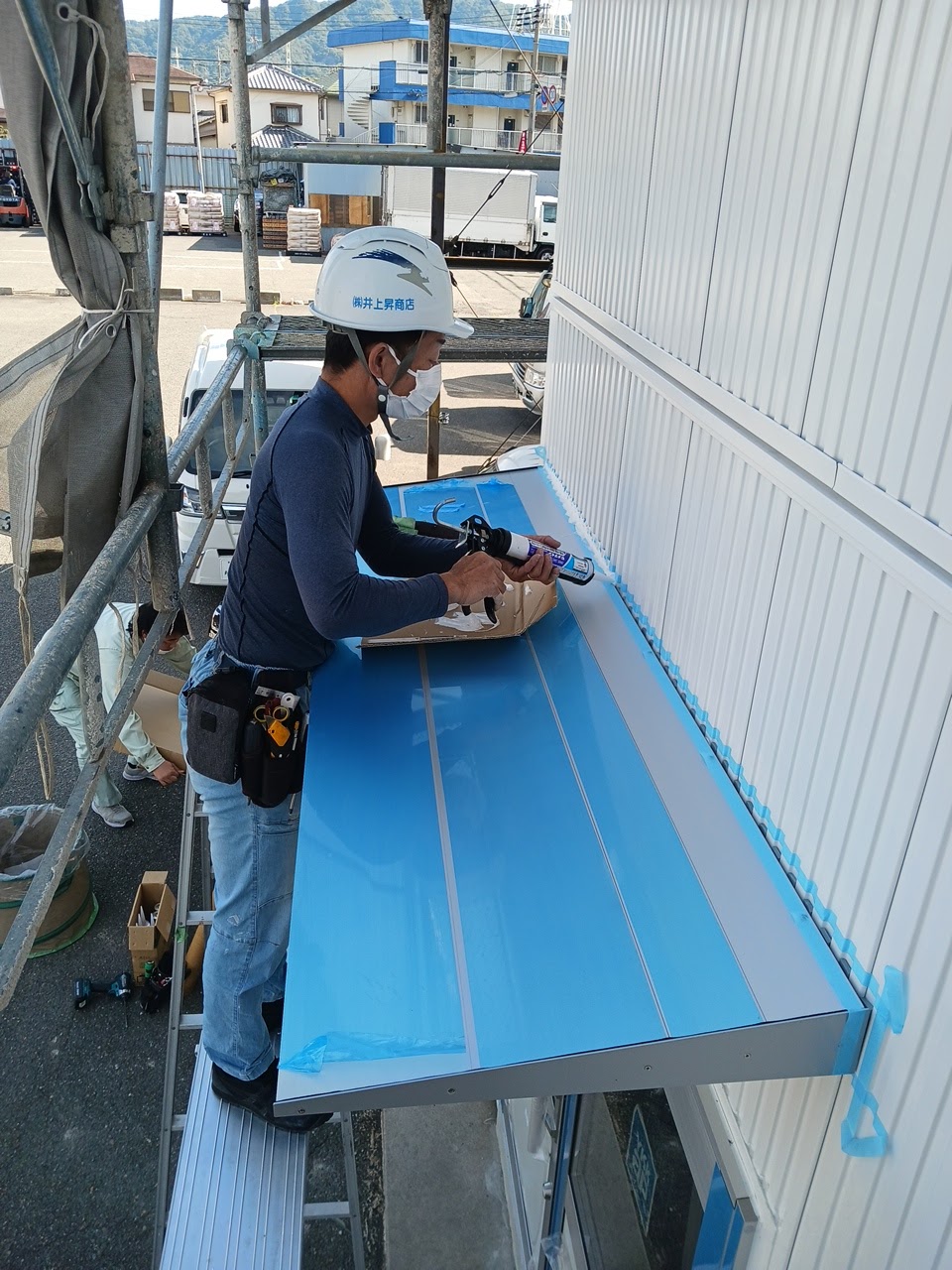 ベースが取付出来たら、ひさし本体を取り付けます。ひさし本体とベースをビスで固定したら、ひさしの天端をコーキング処理していきます。