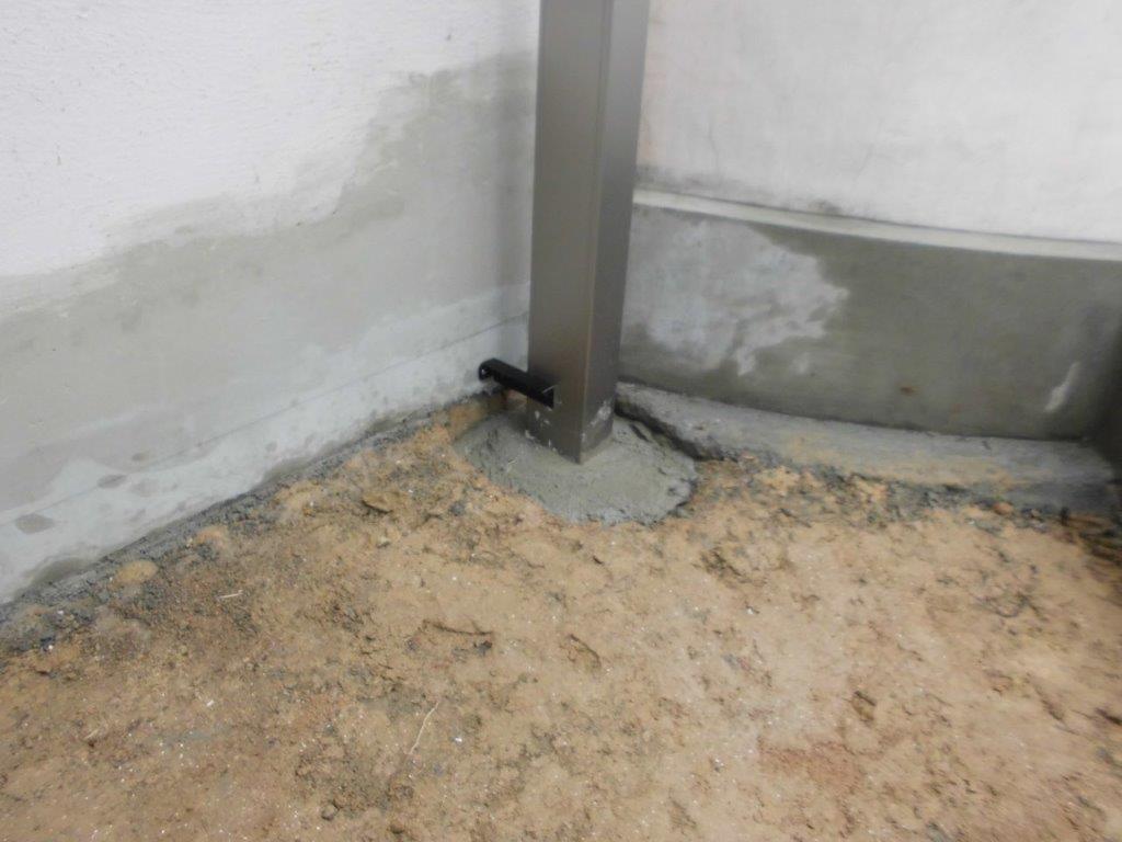 施工中②2本の柱を歪みの無い様に設置モルタルで固めます。