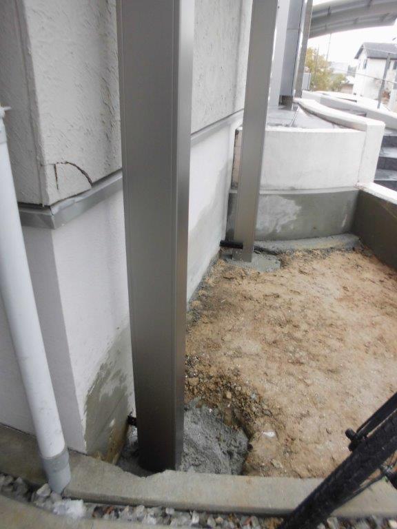 施工中①この日は前日に降った雪が積もっていましたので、最初にその雪を取り除くことから始めました。最初にサイクルポートの柱を設置する場所の掘削を行います。深さ40㎝程、2カ所掘ります。その穴にサイクルポートの柱を垂直に歪みの無い様に設置モルタルで固めます。
