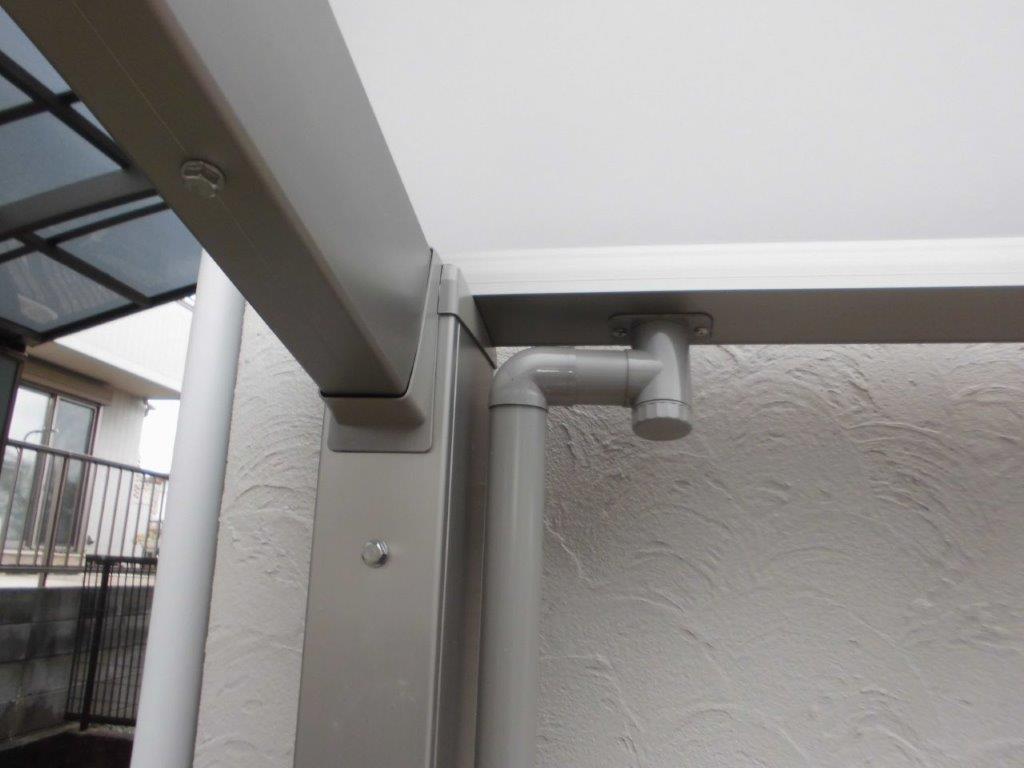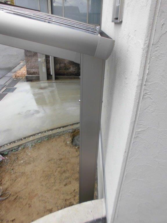 施工後 巾・奥行共に現場に合わせて切断しております。屋根材のポリカーボネートは押え材をビス止めししっかりと固定されています。