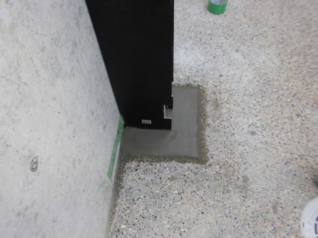 施工中①最初の屋根を支える柱を2本設置します。コンクリートにグラインダーで四角く切断し、そのあとハツリ機で深さ約50センチ程掘削します。柱を水平器で垂直を計測し歪みの無いよう掘削した穴に固定し、モルタルで固めます。