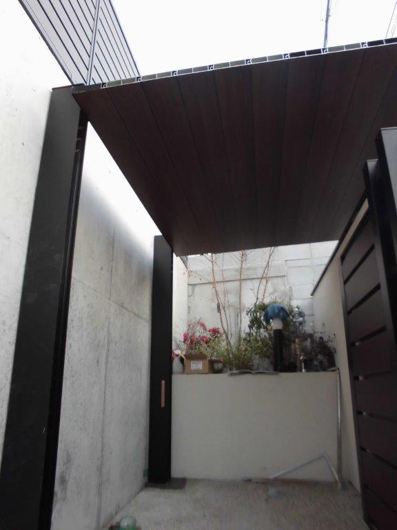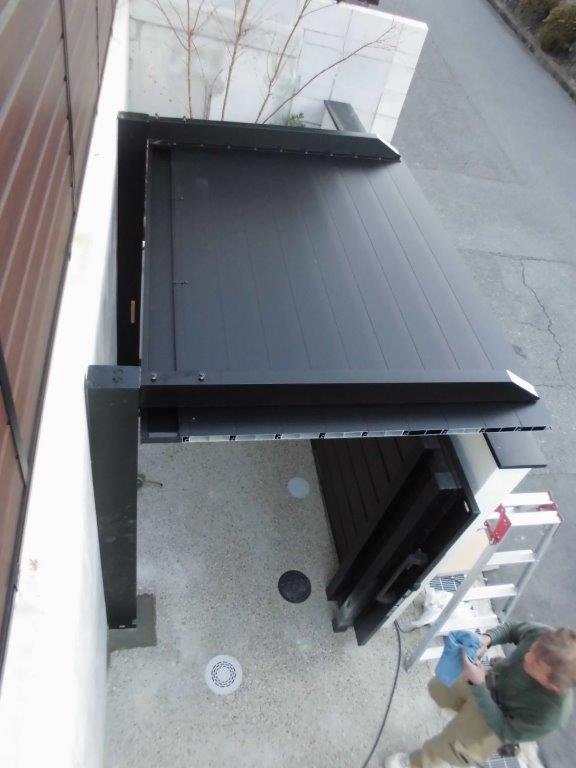 施工後②下側からの施工後写真です。屋根外部側はブラック色ですが、内部側はクリエモカ色の木目シート張りで高級感がある商品です。