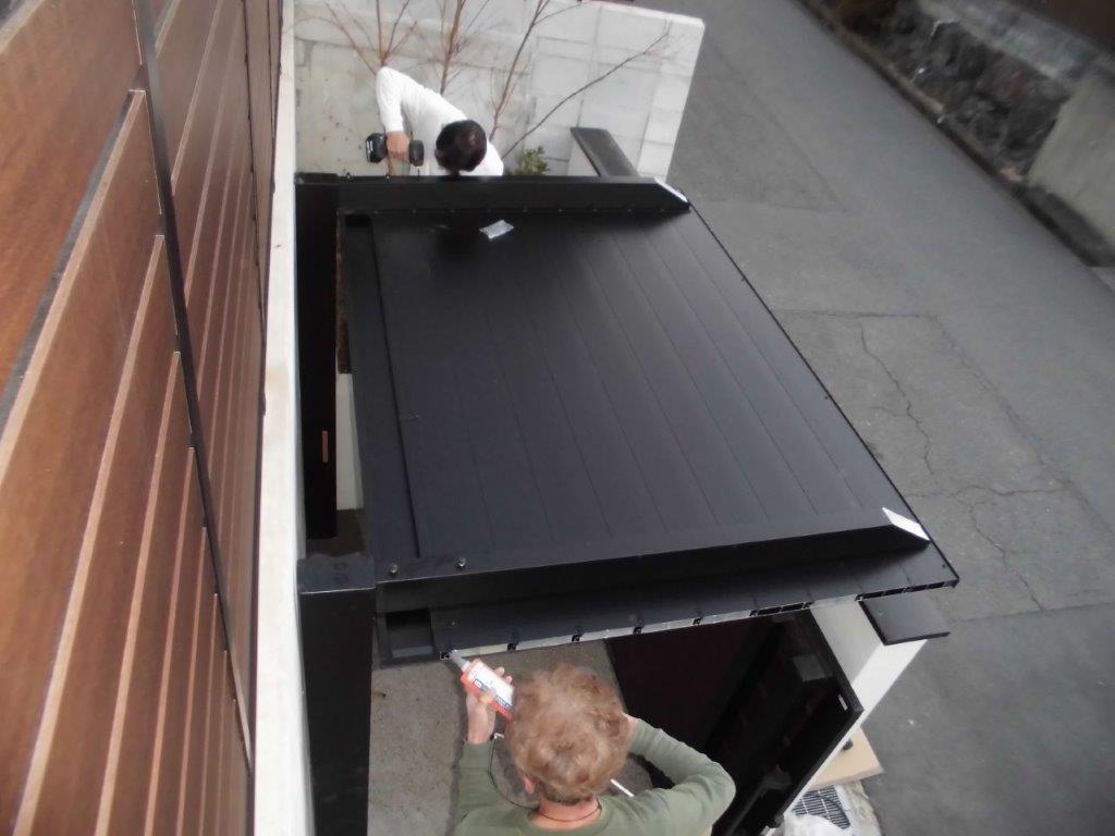 施工中⑥下からの写真です。まだ、アルミ屋根材の小口部見えたままの状態です。