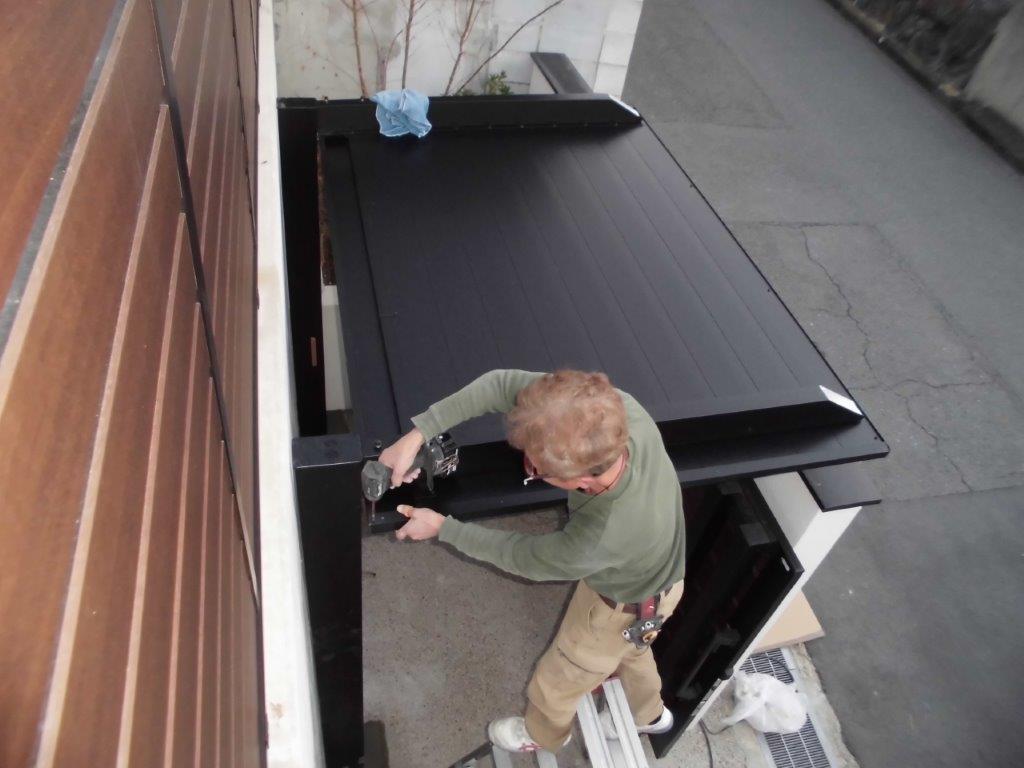 施工中⑧アルミ側面がバー材を電動インパクトドライバーでビス止めしていきます。