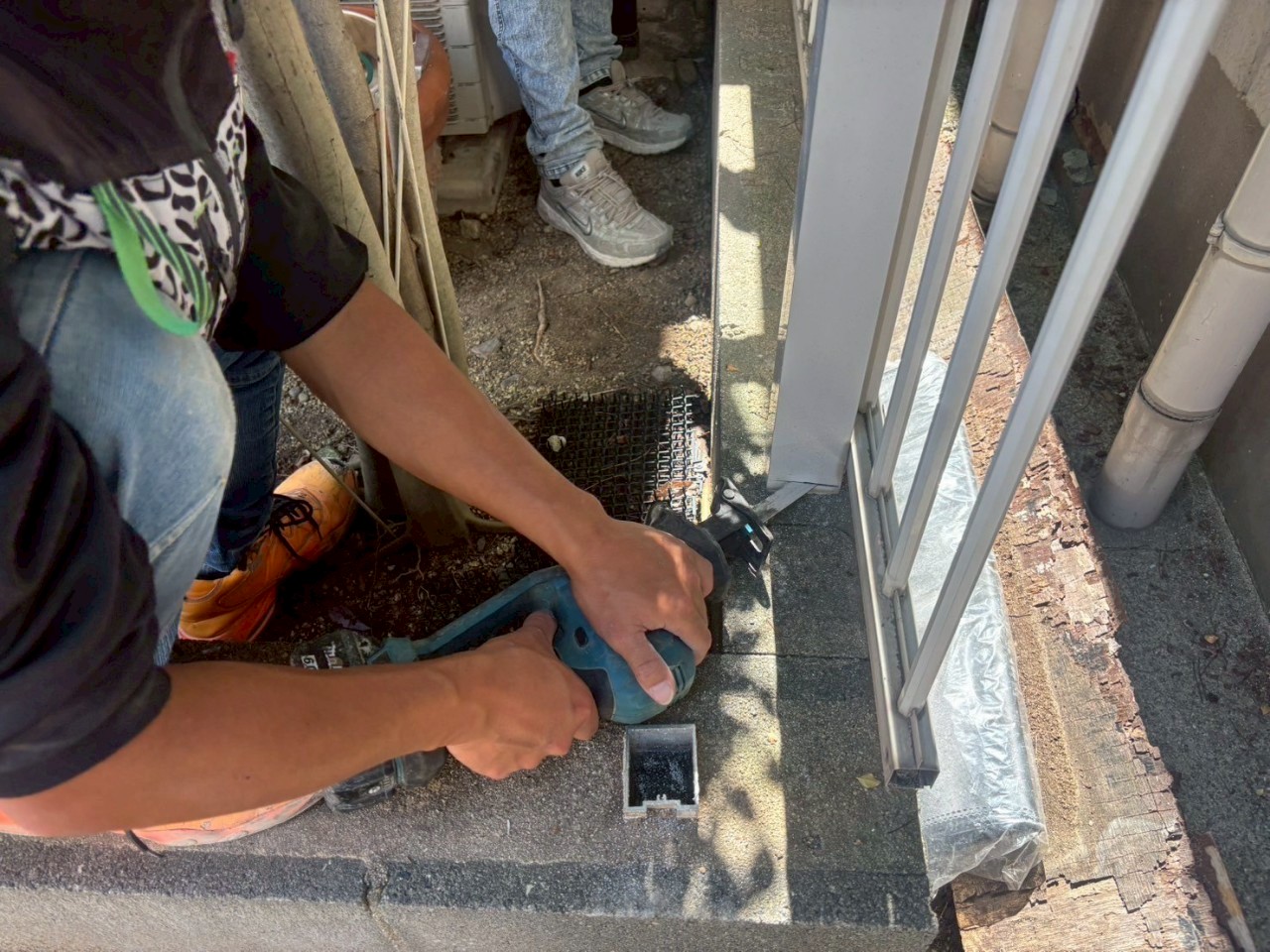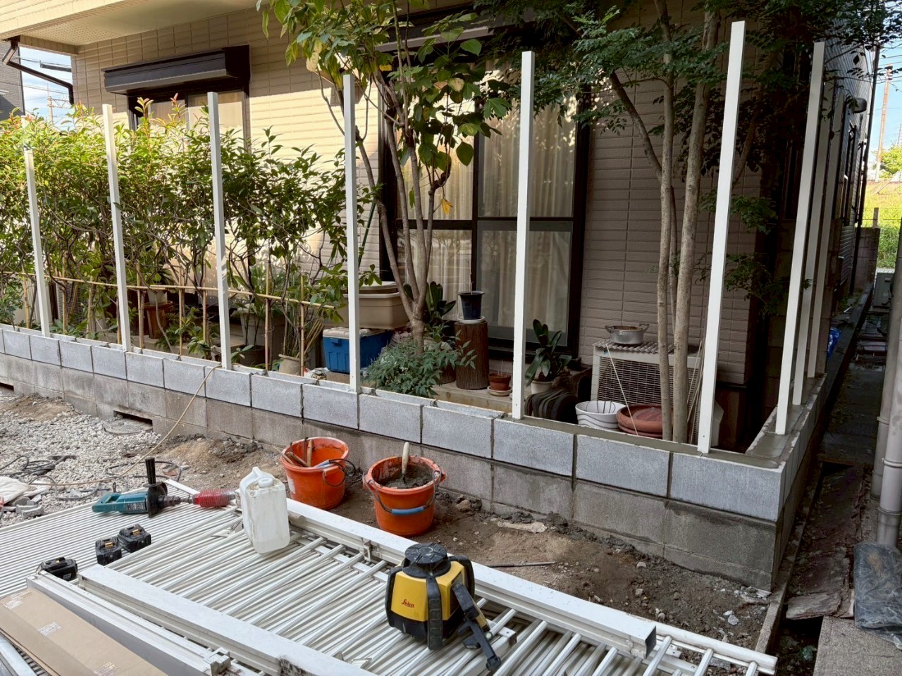 こちらは施工中の写真になります。まずは既存のフェンスを取り外していきます。フェンスの柱は、モルタルで固めれれている為、ブロックの際でカット致します。