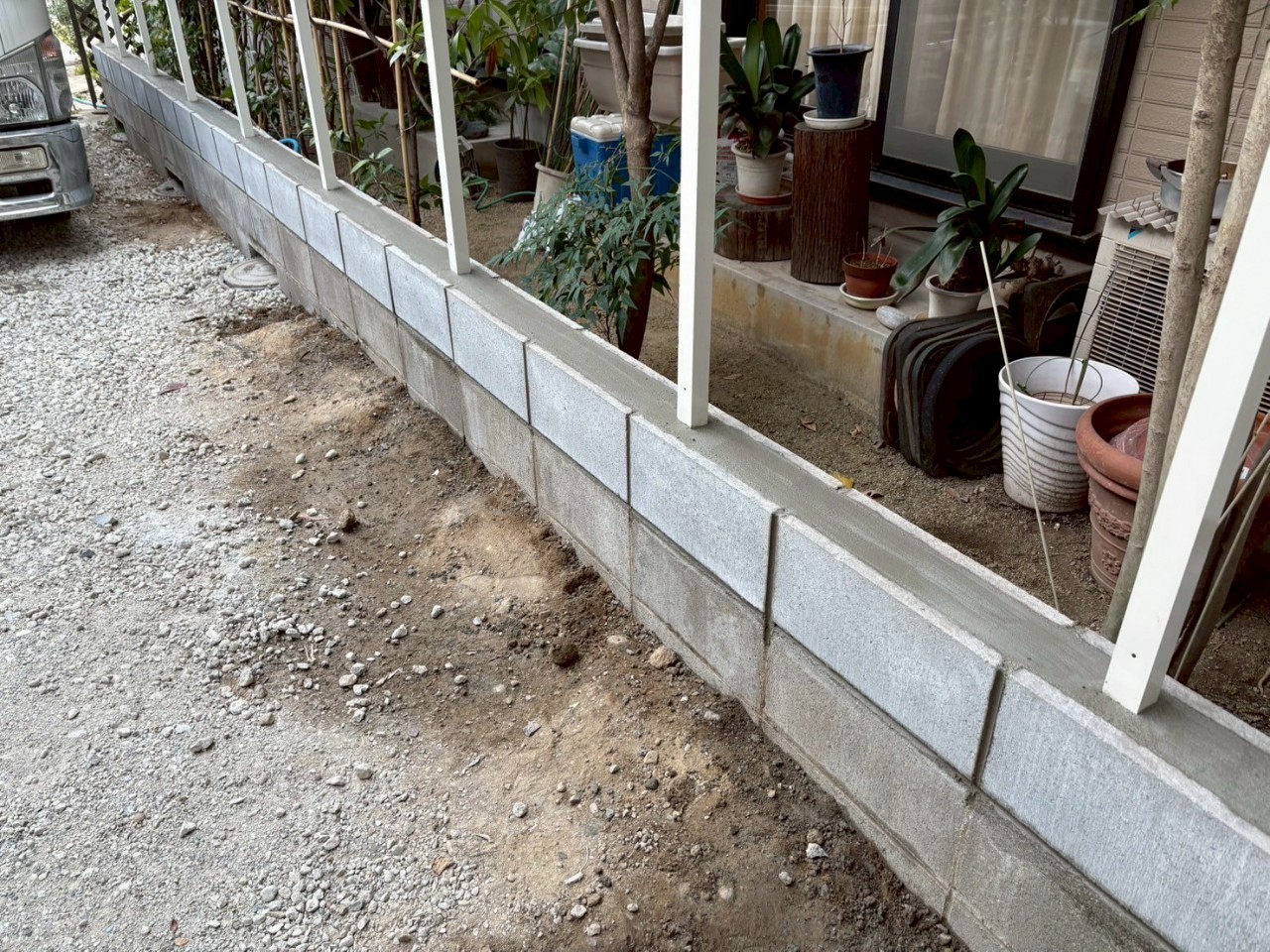 今回は、埋めシロの確保のために、ブロックを1段新設致しました。既設ブロックにはコアで穴を開けて、新しいブロックに柱をさして、モルタルで固めます。