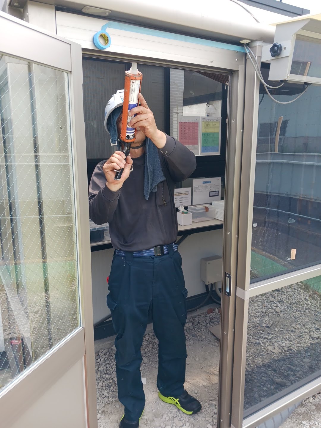 ドア枠の取付が終わったら開閉確認をして、問題無ければ枠回りをコーキング処理していきます。