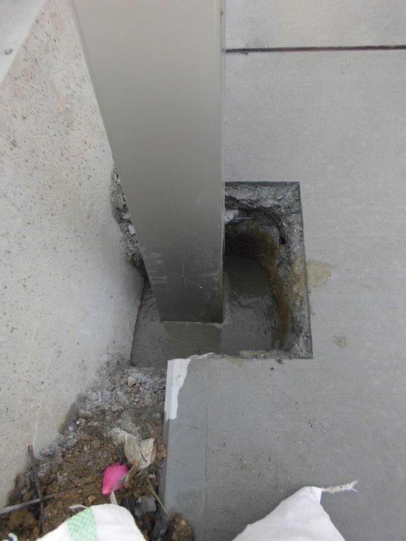 施工中① 新設カーポートの柱位置(4カ所)を決め、コンクリート部を掘削し、その穴に柱を固定し、モルタルで固めていきます。