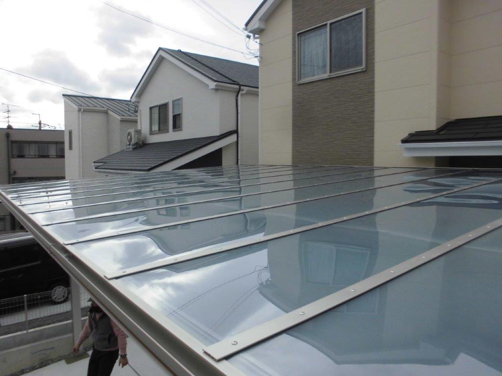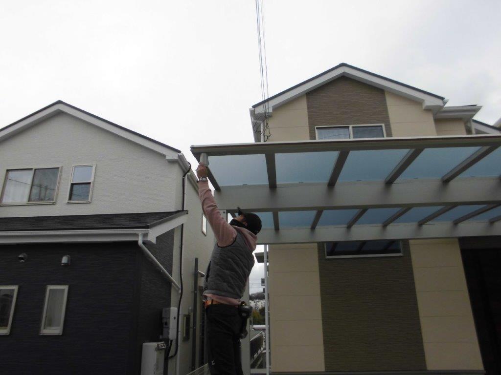施工中⑤ 全ての骨組みが結合できましたら、屋根材(熱線遮断ポリカーボネート)を設置し、屋根押え材で風で飛ばないように固定します。