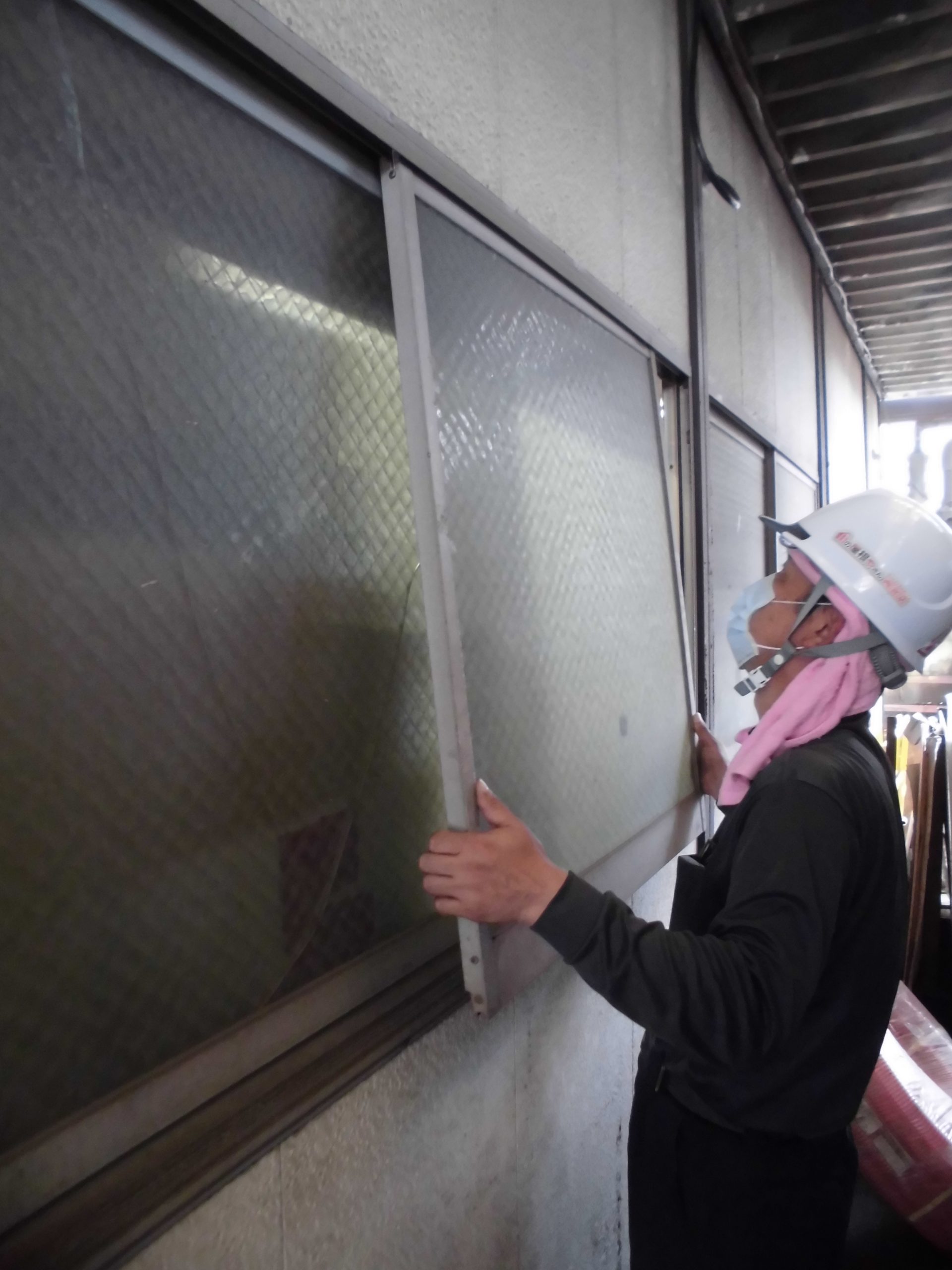 吹田市 工場内管理室窓サッシ4カ所、ガラス8枚カスミヒシワイヤー取替しました。