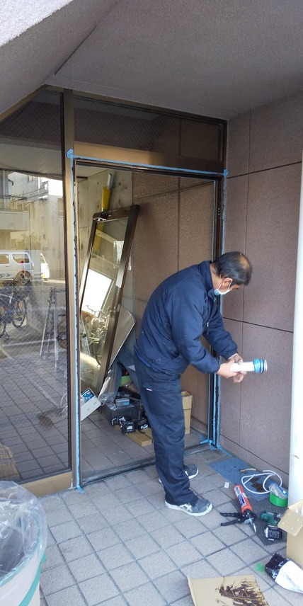 枠の固定が終わったら、枠周りをコーキング処理していきます。