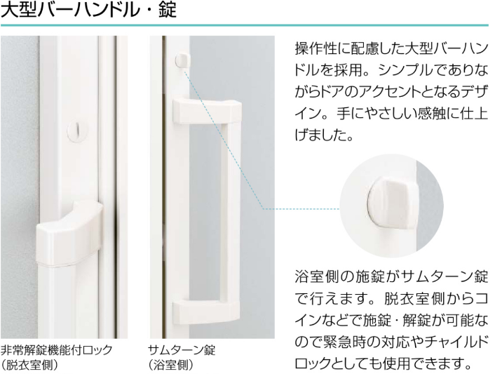 YKK AP浴室ドアは大型ハンドルを採用しているので、握り玉に比べると開け閉めもしやすくなります。