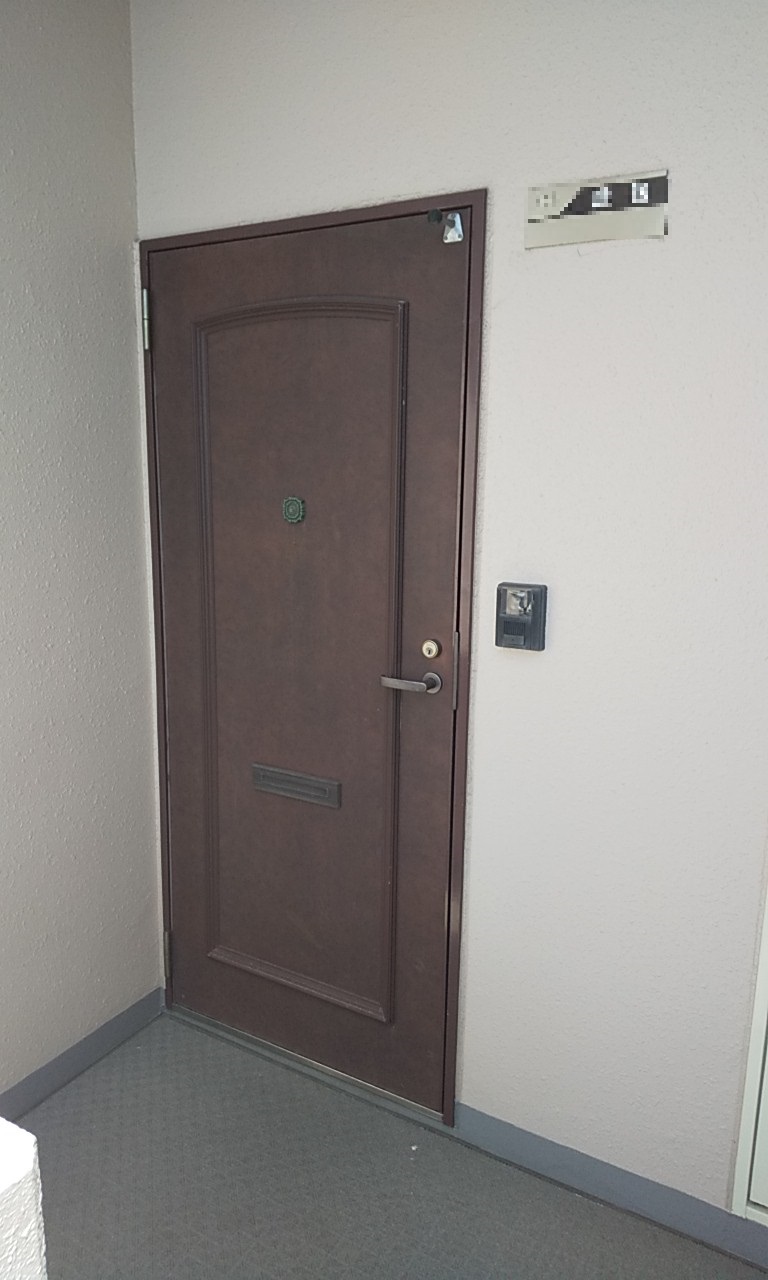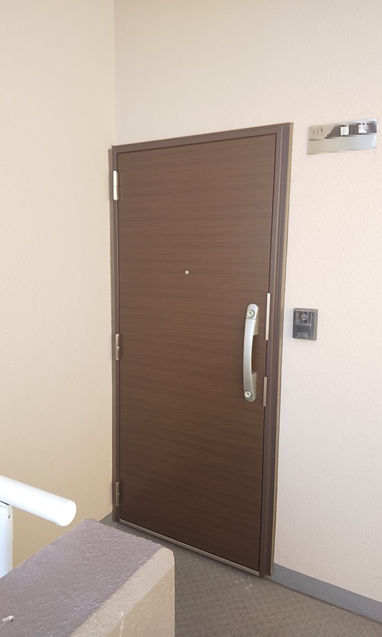 今回ご紹介するのは、先日お伺いした賃貸マンションの玄関ドアのお取替えの現場です。賃貸マンションのオーナー様から「玄関ドアが古くなってきたので、取り換えて欲しい。」とご要望を頂きました。現状はスチール製のドアで、鍵はワンロックのレバーハンドル錠でした。