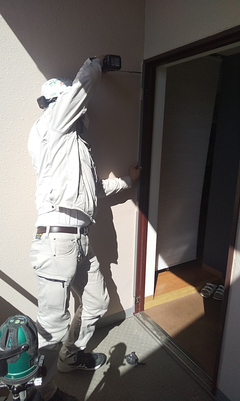 下地材が取付出来たら、新しい枠を固定していきます。この時、枠に歪みが無いように水平、垂直を確認しながら取り付けていきます。枠に歪みがあるとドアの開閉に不具合が出てしまうため、きっちり確認しながら取り付けていきます。