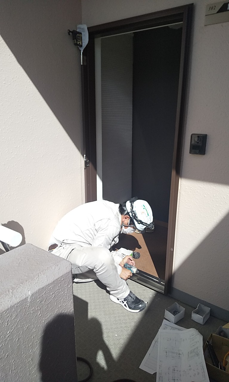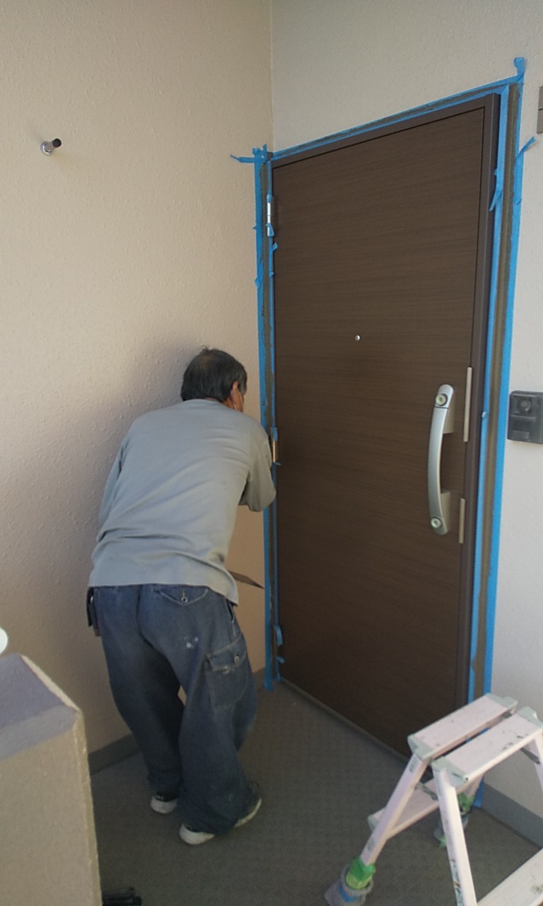 枠の固定が出来たら、ドア本体を建て込みます。ドアクローザーの調整、鍵受けの調整が出来たら、枠周りをコーキング処理していきます。コーキング処理することで、ドアの気密性を保ち、ドアからの雨漏れも防ぎます。