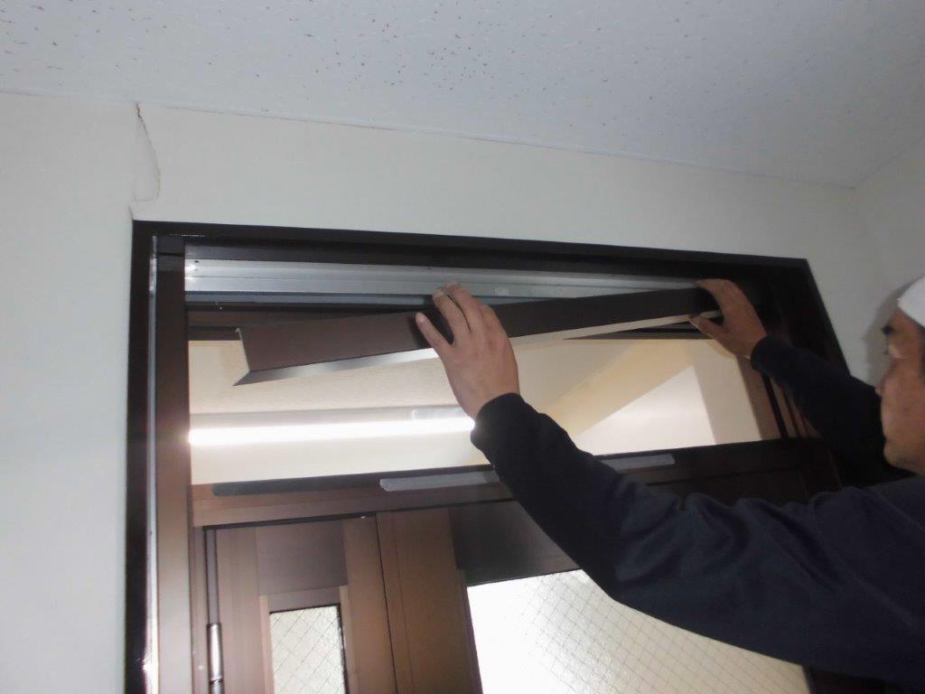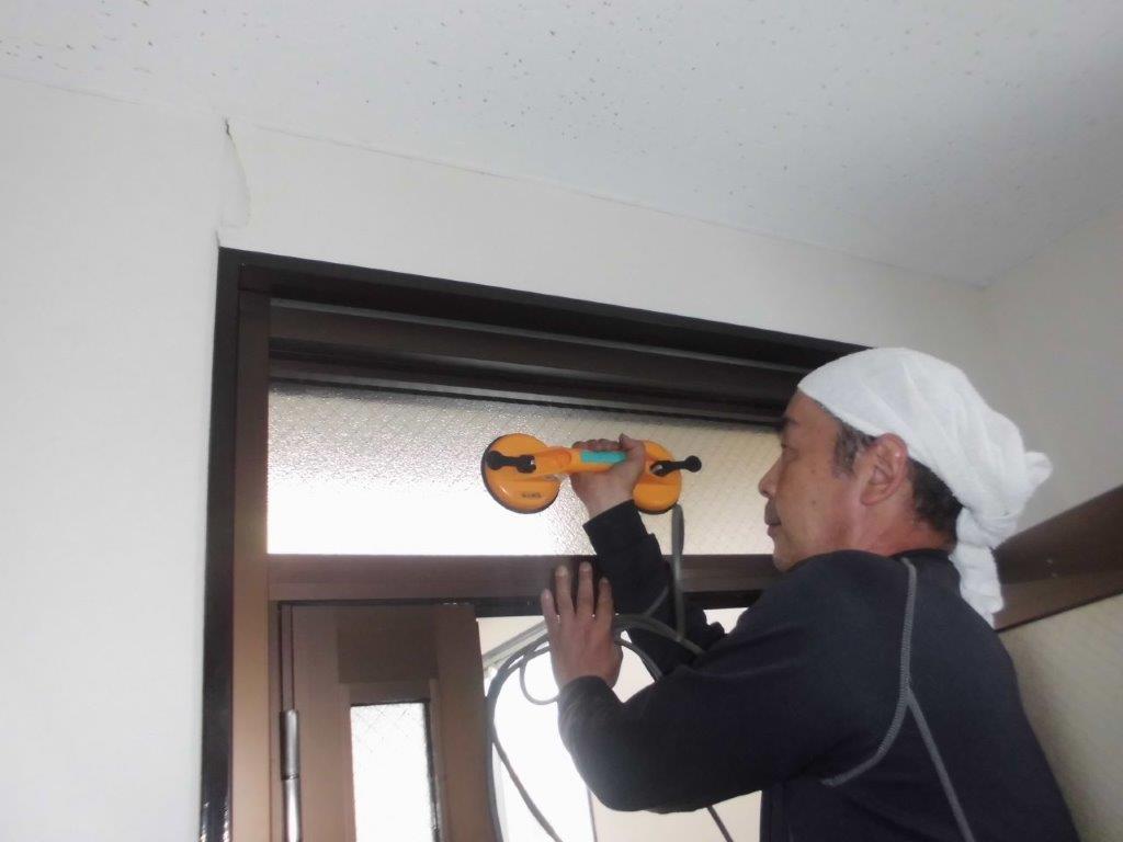 施工中⑨ 内外上部左右にアルミ曲物の取付が完了しましたら、ランマ部に硝子をはめ込みます。