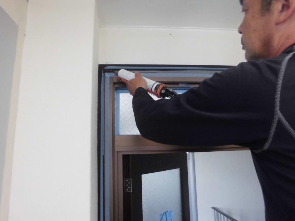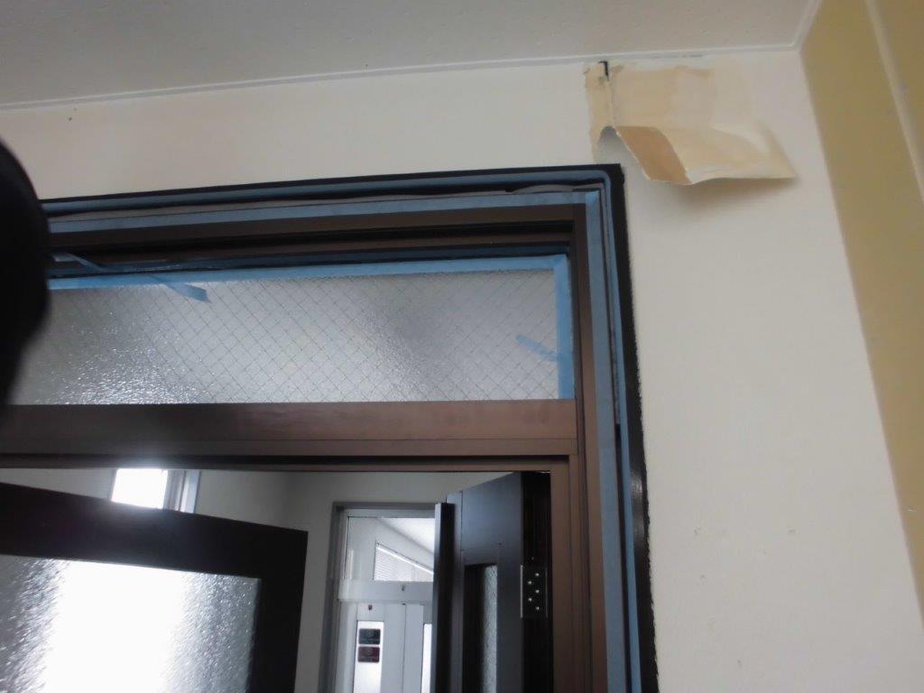 施工中⑩ ランマ部硝子固定コーキングと既存枠と新設アルミ曲物の隙間コーキングをしていきます。コーキングが直線に綺麗に仕上るように、マスキングテープを貼り付けています。