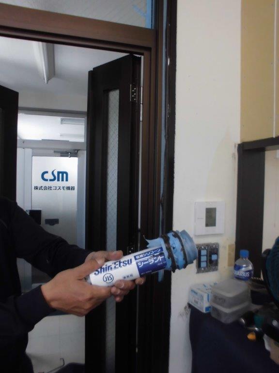 施工中⑪ コーキングガンを使用し、コーキングを充填していきます。