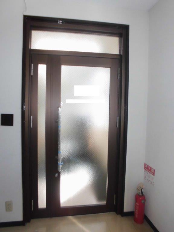 吹田市 アルミフロントランマ付親子ドア(電気錠仕様)をカバー工法での取付施工例です。